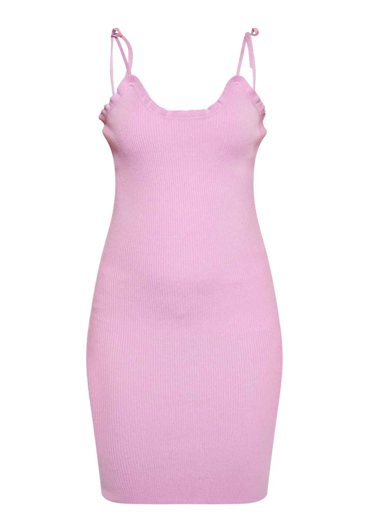 Deze tot in de perfectie op maat gemaakte jurk met bandjes is een must-have voor wie oog voor detail op prijs stelt. Deze mini-jurk heeft delicate bandjes die in strikken op de schouders worden geknoopt, heeft een geribbelde textuur en ruches aan de diepe, ronde halslijn die een vleugje vrouwelijkheid toevoegen. Het bodycon-silhouet zorgt voor een flatterende pasvorm, terwijl de stretchy gebreide stof moeiteloos je rondingen omlijnt voor een strakke look. Perfect voor zomerse dagen waarop je indruk wilt maken. Jurk