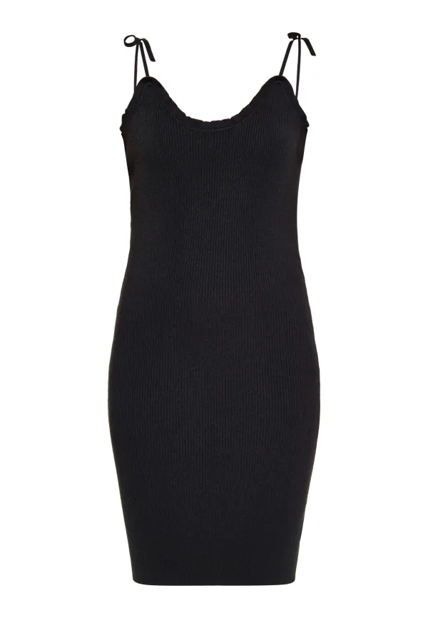 Deze tot in de perfectie op maat gemaakte jurk met bandjes is een must-have voor wie oog voor detail op prijs stelt. Deze mini-jurk heeft delicate bandjes die in strikken op de schouders worden geknoopt, heeft een geribbelde textuur en ruches aan de diepe, ronde halslijn die een vleugje vrouwelijkheid toevoegen. Het bodycon-silhouet zorgt voor een flatterende pasvorm, terwijl de stretchy gebreide stof moeiteloos je rondingen omlijnt voor een strakke look. Perfect voor zomerse dagen waarop je indruk wilt maken. Jurk