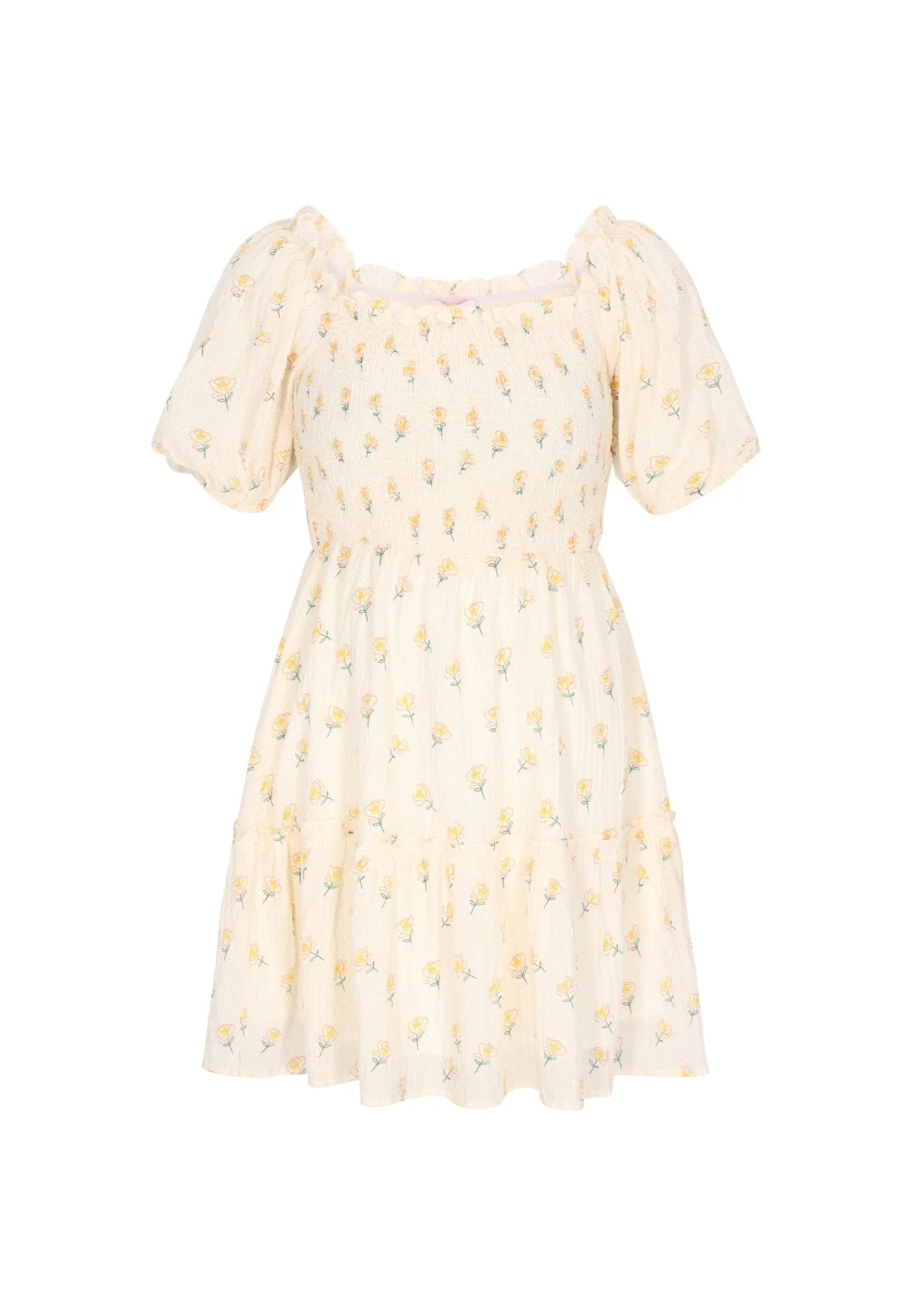 Design: Elastische taille/zoom, Pofmouwen; Type sluiting: Slip; Motief: Bloemenprint; Details: Gedrapeerd; Extra's: All-over patroon; Lengte: Kort/mini; Pasvorm: Normale pasvorm; Armlengte: Kwartmouw