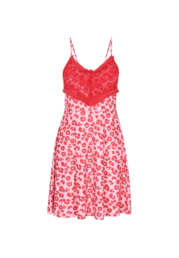 Design: Gevoerde zoom/rand; Type sluiting: Slip; Halstype: V-hals; Motief: Dierenprint; Soort bandjes: Spaghettibandjes; Details: Kant; Extra's: All-over patroon; Lengte: Kort/mini; Pasvorm: Slanke pasvorm; Armlengte: Mouwloos
