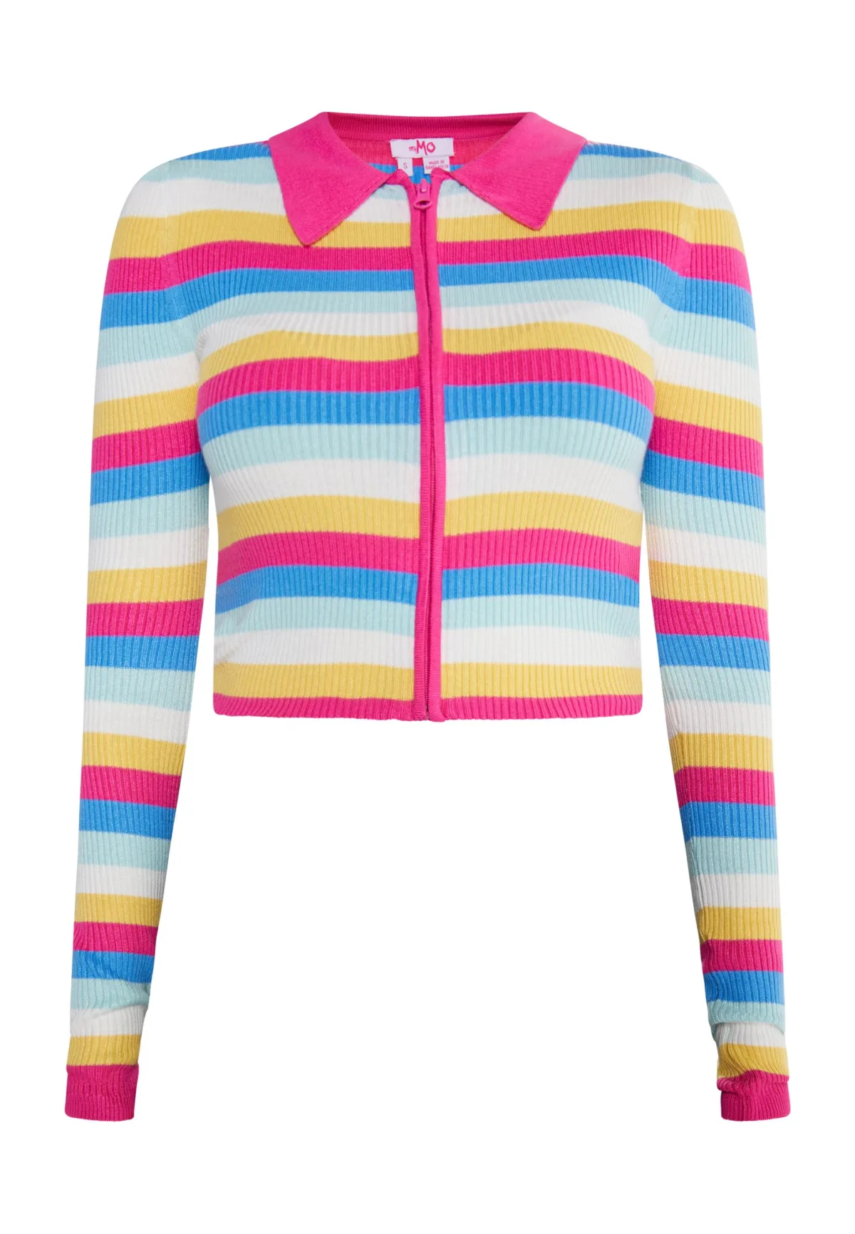 De kleurrijke strepen van het cropped vest van myMo zorgen voor een frisse wind in je garderobe. De zachte viscosemix in een aansluitend silhouet heeft een trendy ribgebreide look, die dankzij de nette kraag en doorlopende ritssluiting een moderne twist krijgt. Gebreide trui