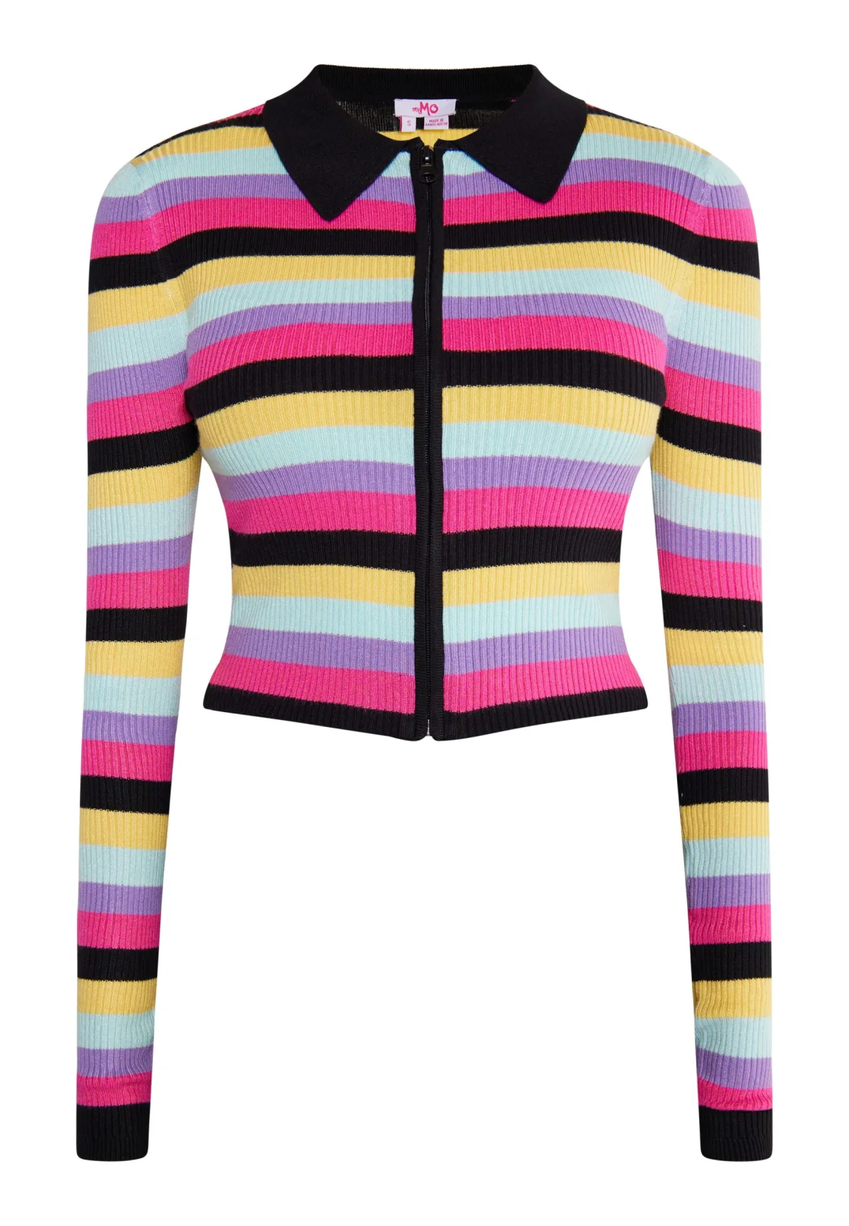 De kleurrijke strepen van het cropped vest van myMo zorgen voor een frisse wind in je garderobe. De zachte viscosemix in een aansluitend silhouet heeft een trendy ribgebreide look, die dankzij de nette kraag en doorlopende ritssluiting een moderne twist krijgt. Gebreide trui