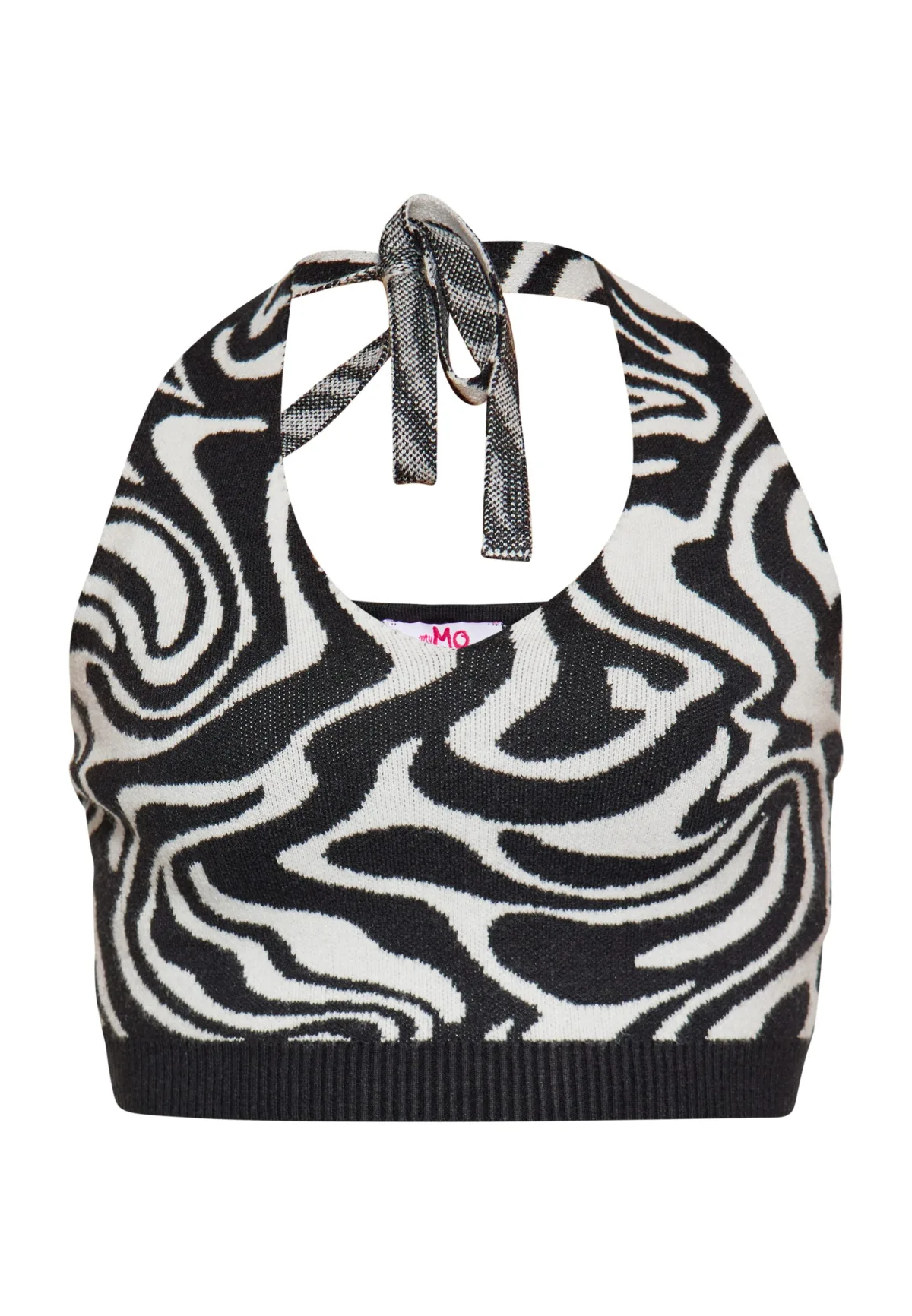 Deze gebreide haltertop is met precisie vervaardigd en heeft een vloeiend abstract patroon. Het gestrikte silhouet aan de bovenkant en de geribde zoom aan de onderkant voegen een vleugje verfijning toe aan de algehele look. Deze crop-top heeft een ronde halslijn en een verstelbare strikband aan de achterkant en straalt een eigentijdse charme uit. Het boeiende swirly-patroon zal zeker indruk maken. Top
