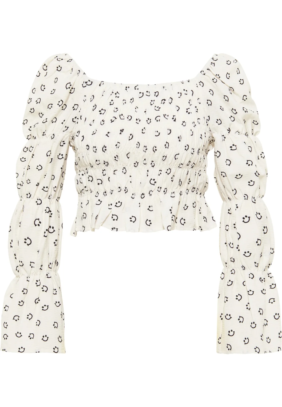 Geen voering/geen voering, geen vulling Dit myMo ROCKS shirt zal een glimlach in je garderobe toveren. Dankzij de plooistructuur op de mouwen en borst streelt de lichte stof het figuur nonchalant. Het ontwerp krijgt een bijzondere component door de all-over print met de smileygezichten. Met jeans en sneakers creëer je de perfecte alledaagse look! Longsleeve