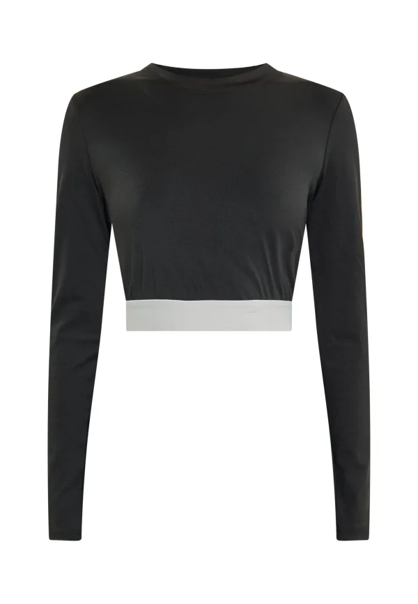 Creëer een sportieve en athleisure-look met deze elastische crop top met lange mouwen. Het aansluitende silhouet en de elastische gebreide stof bieden comfort en flexibiliteit voor uw actieve levensstijl. Deze lange mouw heeft een ronde halslijn met fijne ribboorden en is perfect voor casual of atletische kleding. Het kortere ontwerp is ideaal voor yogasessies of dagelijkse activiteiten en voegt een trendy tintje toe aan je garderobe. Longsleeve