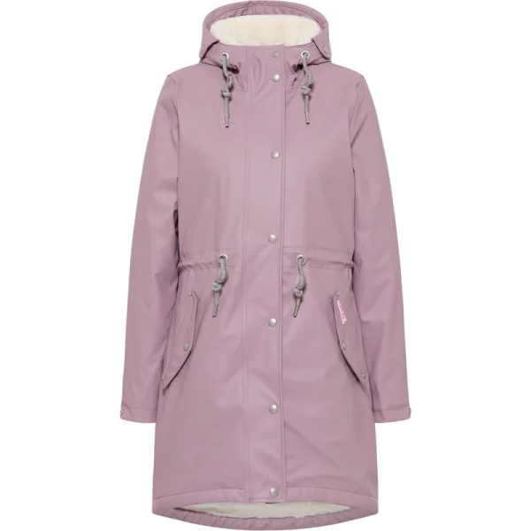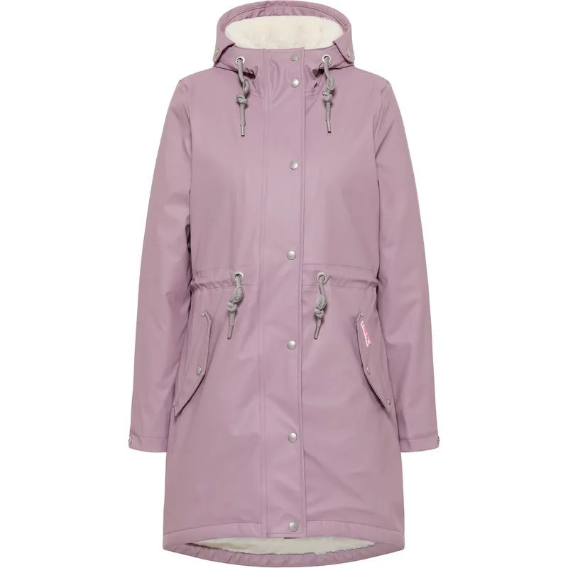 Hier komt kleur om de hoek kijken. De myMo regenjas maakt grijze herfst- en winterdagen wat vrolijker. De wind- en waterafstotende regenparka heeft een fantastische lengte, terwijl de zachte voering van imitatiebont u ook op koude dagen behaaglijke warmte biedt. Extra bescherming wordt geboden door het gecoate materiaal, de gevoerde capuchon met stevig koord en de verborgen ritssluiting. Kritieke plekken zoals de naden of de zakken zijn afgedicht of beschermd met flappen. Met het trekkoord in de taille kunt u de toch al licht getailleerde jas nog dichter bij uw figuur dragen.