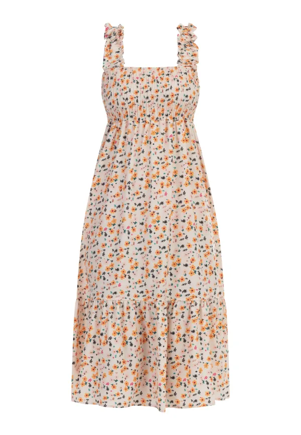 De bloemenprintjurk van myMo belooft een zomer vol romantiek. Het model, gemaakt in Italië, wordt ondersteund door de brede gesmokte bandjes en de gesmokte bovenkant. Het lichte, kreukvrije materiaal wordt gecompleteerd door de volant aan de rok. midi-jurk