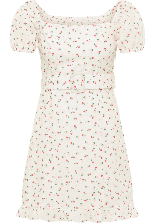 Dit jurkje van myMo is makkelijk om verliefd op te worden, want het smalle, korte jurkje, met gesmokte achterkant, is all-over bedrukt met suikerzoete aardbeien en kersen. De zomerjurk is gemaakt van licht katoen en een binnenvoering zorgt voor ondoorzichtigheid. Dankzij de elastische pofmouwen kan de jurk ook off-shoulder gedragen worden. De riem met gesp geeft het ontwerp een brutale twist, net als de ruche aan de zoom. Jurk korte mouw mini