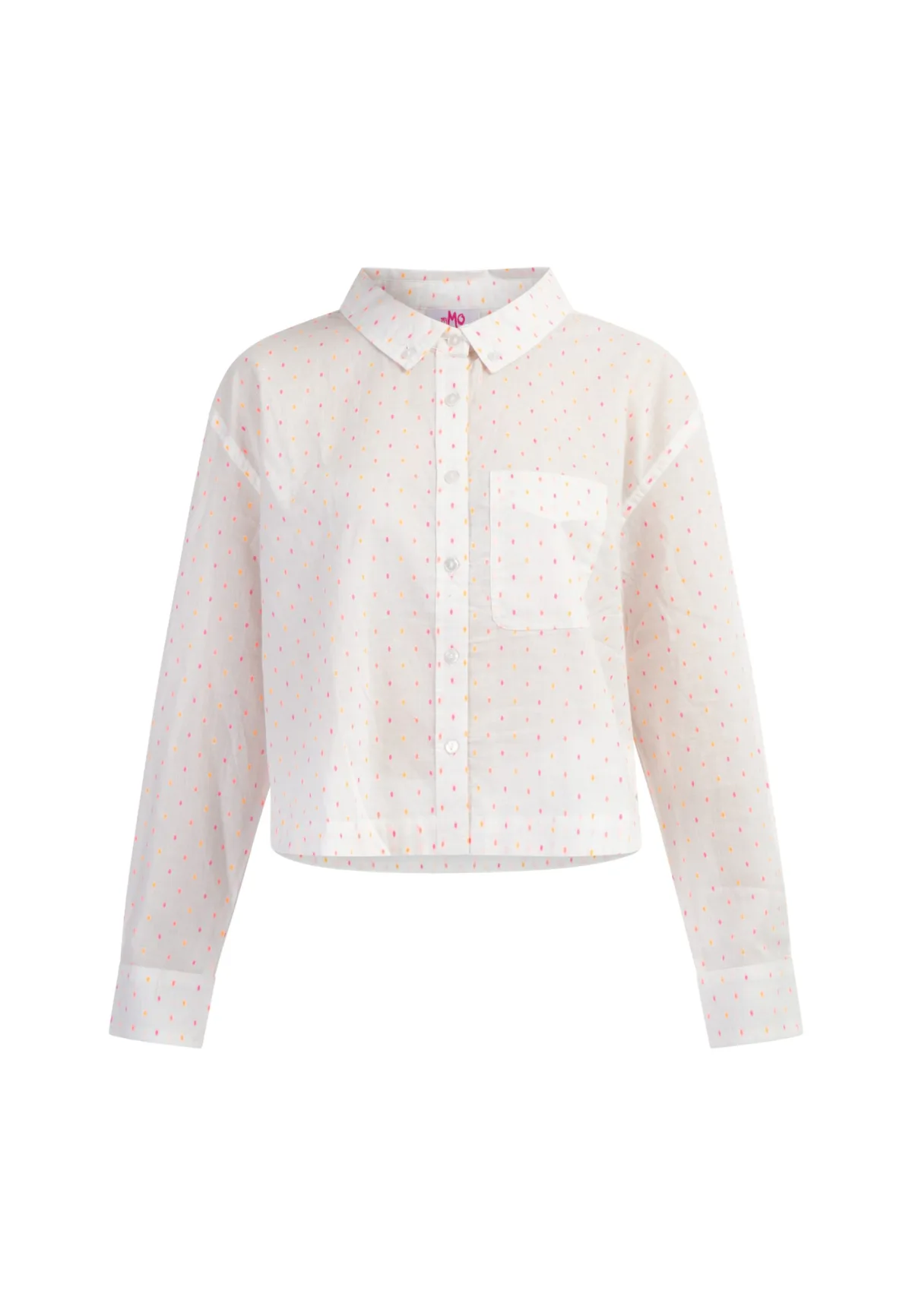 Het luchtige, lichte materiaal en de frisse stippenprint geven de cropped blouse van myMo een stijlvolle zomerlook. Uitgerust met een button-down overhemdkraag, doorlopende knoopsluiting en een borstzak, krijgt het model door de gevormde zoom een bijzonder moderne touch. De lange mouwen eindigen in brede manchetten. Bloes met lange mouwen