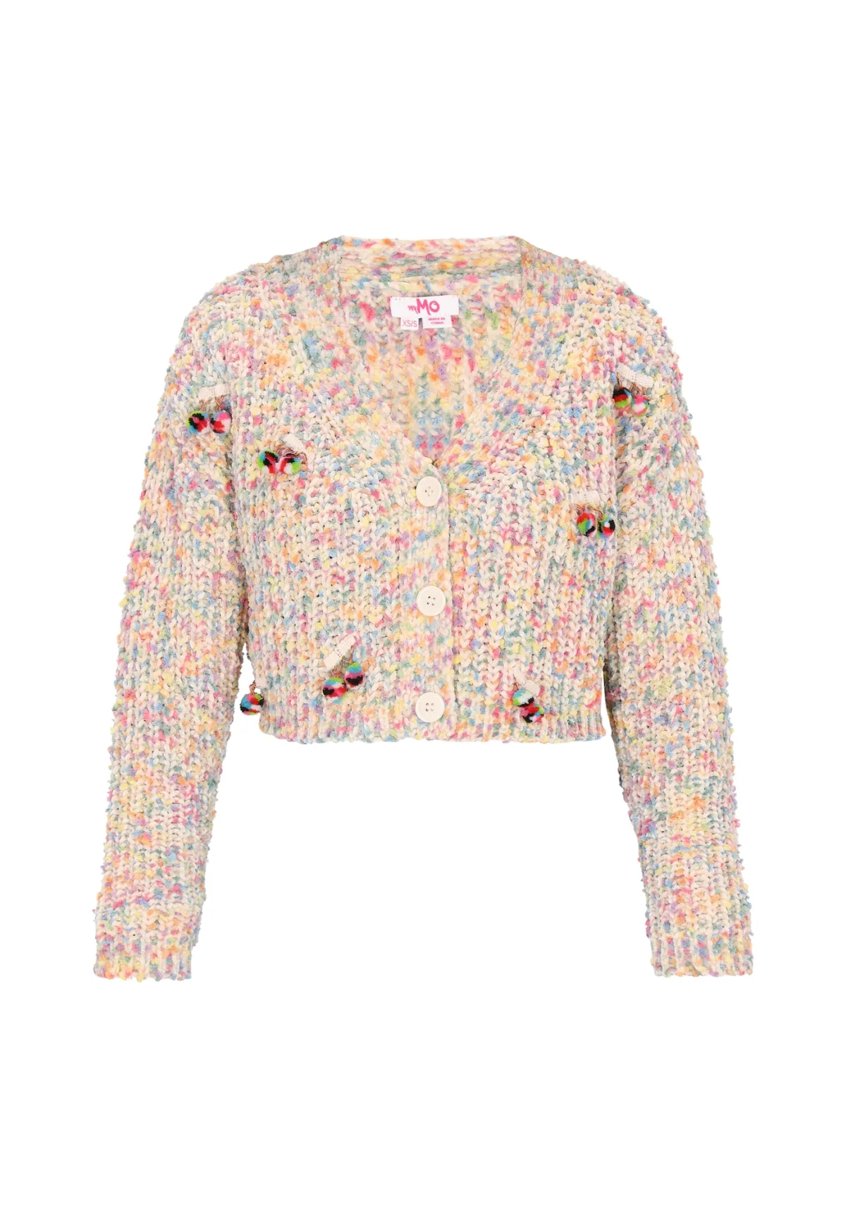 Design: Geribbeld gebreid; Type sluiting: Knoopsluiting; Materiaal: Knitwear; Halstype: V-hals; Motief: Mélange; Extra's: All-over patroon, Applicaties; Pasvorm: Losse pasvorm; Armlengte: Lange mouw; Lengte: Korte pasvorm