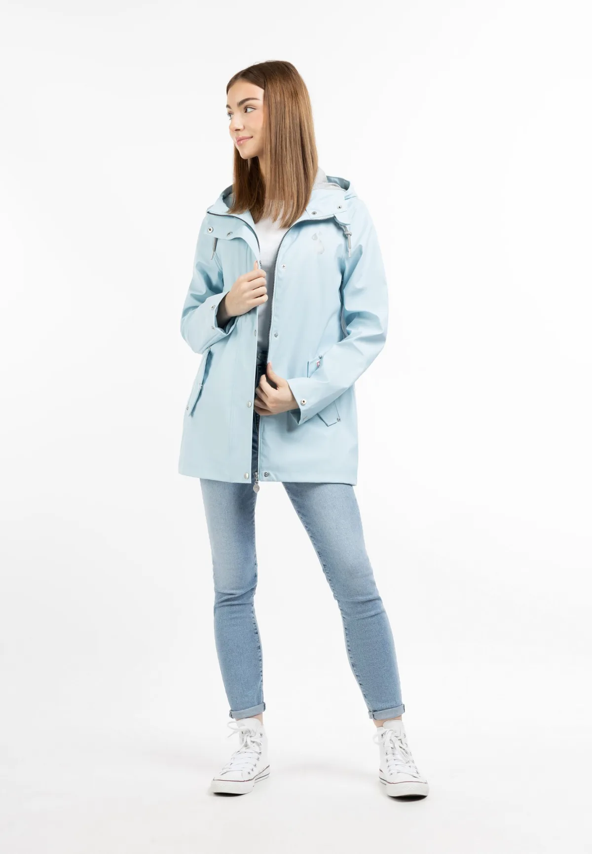 Voor natuurliefhebbers, fietsers of hondenuitlaters is een regenjack elementair. Wat goed dat myMo ook een jas in het repertoire heeft die ideale regenbescherming biedt. Het gecoate materiaal is wind- en waterdicht en is bestand tegen alle weersomstandigheden. De licht getailleerde, halflange vorm biedt met de brede capuchon en glinsterende koorden extra bescherming tegen de regen. Ook de drukknoopsluiting over de ritssluiting en de schuine klepzakken optimaliseren de jas op het gebied van weersbestendigheid.