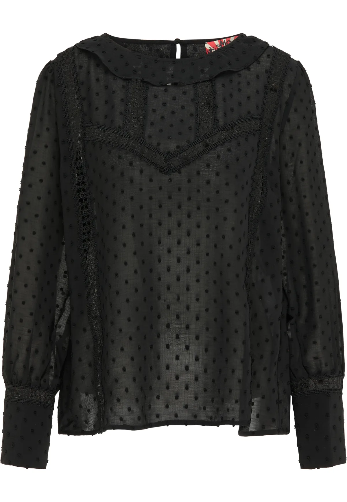 Dit romantische stuk hult u in delicaat kant en semi-transparante crêpe stof met gestructureerde stippen. De ronde halslijn met de vloeiende volantkraag is bijzonder trendy. Filigraan kant aan de voorkant laat de huid zien en straalt een onweerstaanbare nostalgische charme uit. Combineer het met jeans en laarzen voor een hippe stijlbreuk.