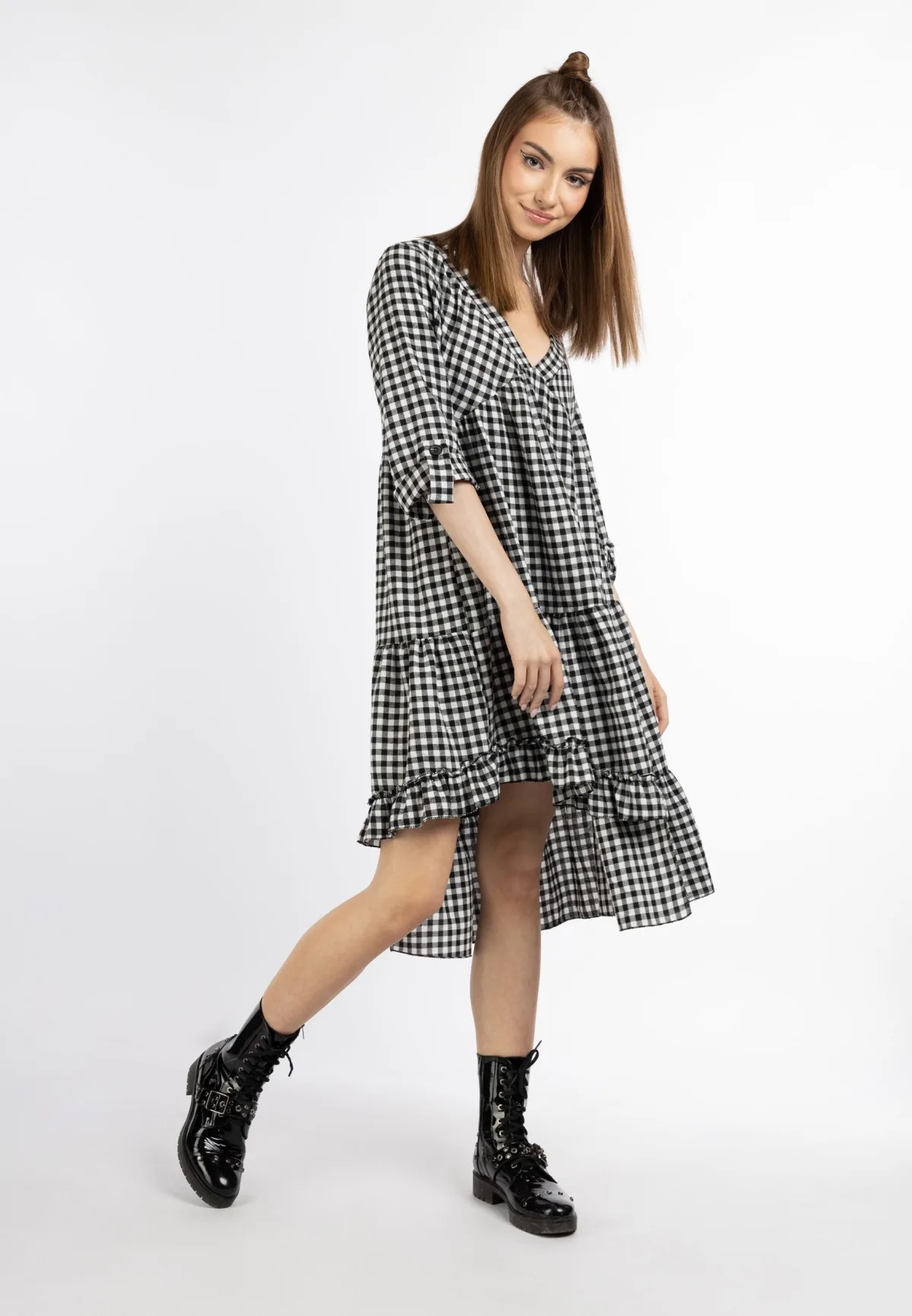 De losse midi-jurk van myMo ROCKS heeft een ruitjespatroon en een asymmetrische volantzoom voor een casual, punky touch. Vooral de combinatie met lakleer, studs en grove laarzen maakt de look compleet.