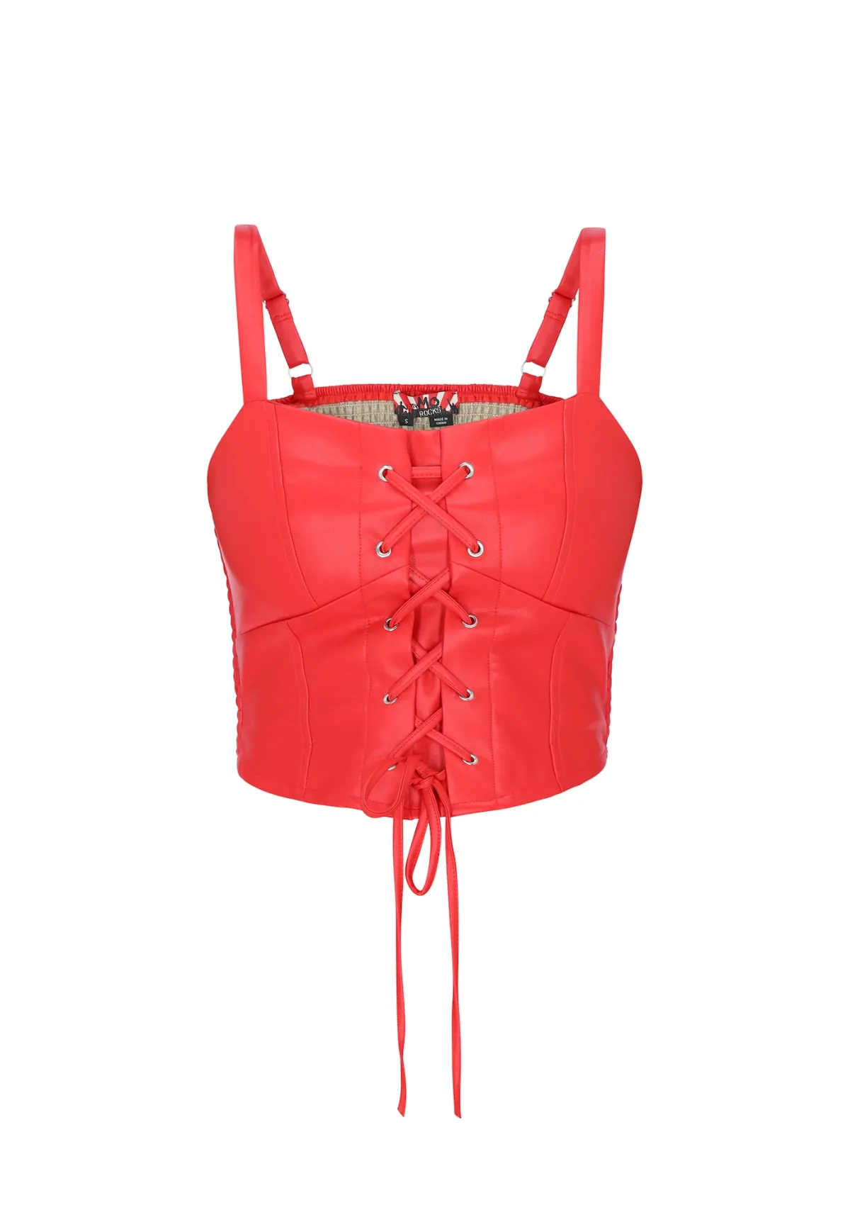 Design: Vetering; Materiaal: Imitatieleder; Halstype: Carréhals; Motief: Effen; Soort bandjes: Spaghettibandjes; Details: Korset; Extra's: Verstelbare bandjes; Pasvorm: Aansluitende pasvorm; Armlengte: Mouwloos; Lengte: Korte pasvorm