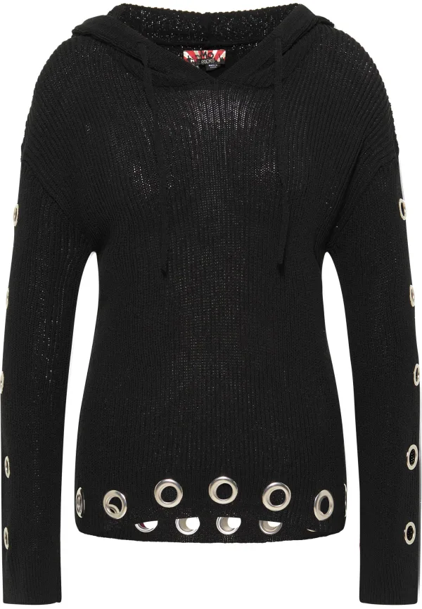 De grote oogjes aan de mouwen en zoom geven de trui van myMo ROCKS de typische rocky touch. Het model is gebreid van een zacht garen en heeft een losse snit zonder manchetten. Een capuchon met trekkoord completeert het harmonieuze geheel.