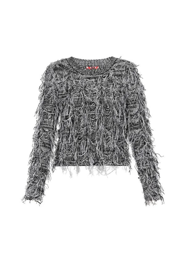 Design: Geribbelde kraag; Materiaal: Knitwear; Halstype: Ronde hals; Motief: Mélange; Details: Franjes; Extra's: Fully fashioned; Pasvorm: Normale pasvorm; Armlengte: Lange mouw; Lengte: Normale lengte