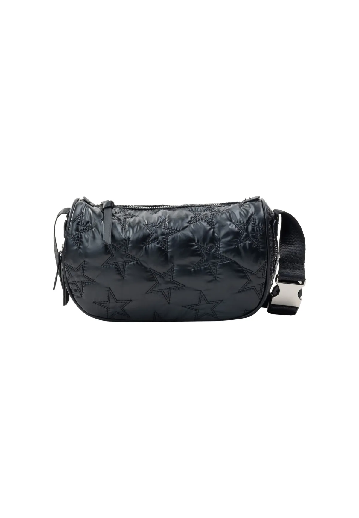 Met de gewatteerde handtas van myMo ROCKS heb je een stoer en praktisch accessoire, gemaakt van een zacht buitenmateriaal met een sterrenmotief in reliëf. De robuuste ritssluiting loopt over de tas heen, waardoor je gemakkelijk spullen op kunt bergen. De brede draagriem is verstelbaar en wordt onderbroken door een korte schakelketting. Kleine tas