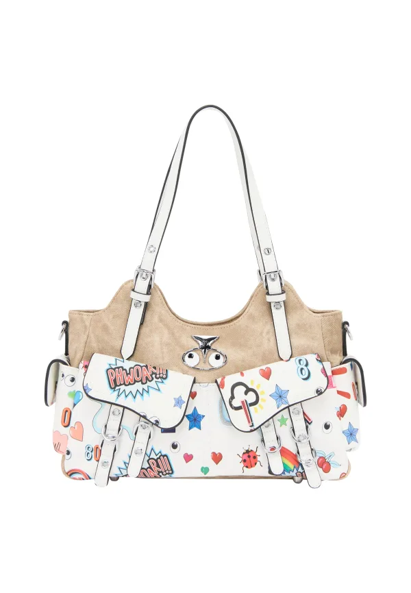 MYMO Schoudertas ‘Pop Eyetheme’ camel / lichtblauw / knalrood / wit Prijzen