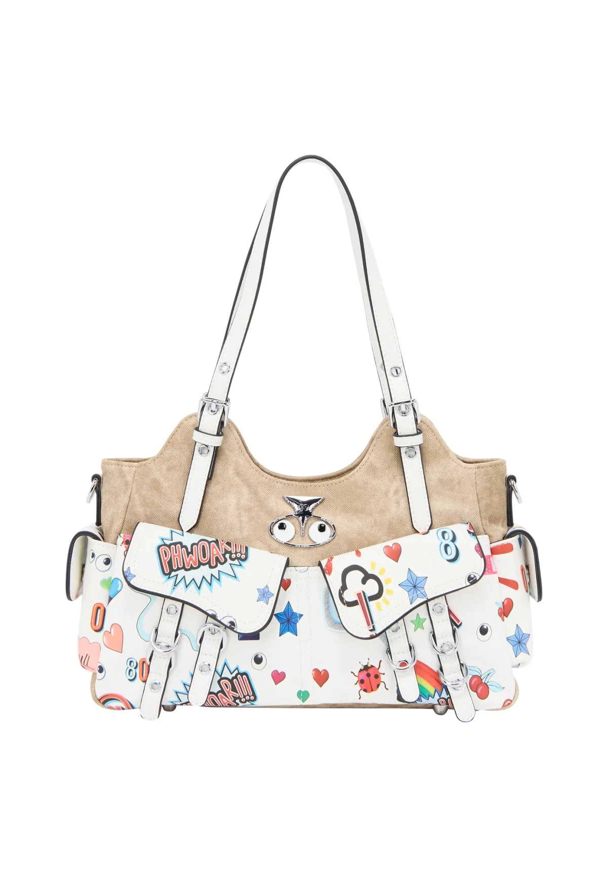 MYMO Schoudertas ‘Pop Eyetheme’ camel / lichtblauw / knalrood / wit