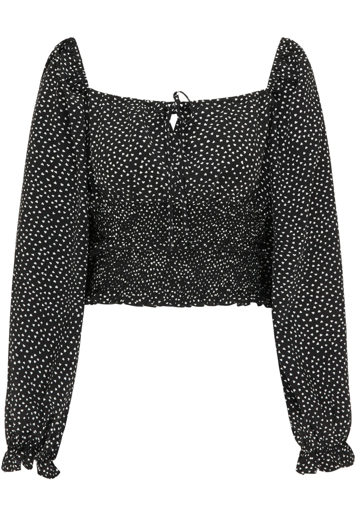 Geef je dagelijkse looks een romantisch tintje met dit schattige shirt met lange mouwen van myMo. Het zachte en vloeiende materiaal met de hartjes all-over print zet je net zo in de kijker als de korte, gesmokte pasvorm. De wijde carmenhals kun je naar wens indelen en is versierd met een strikbandje. De lange mouwen eindigen met een elastische tailleband. Perfect te combineren en tip-top voor vele gelegenheden.