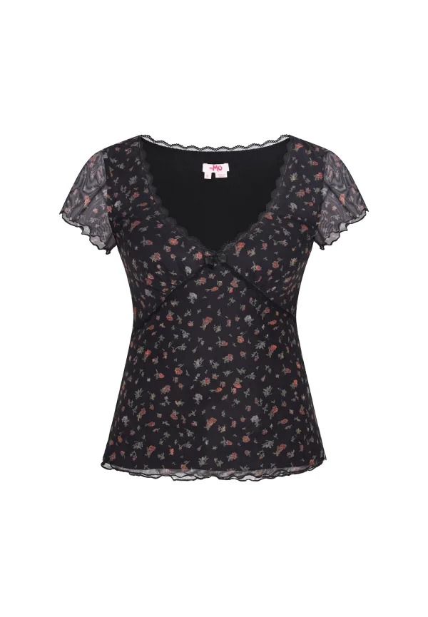 Blouse type: Blouseshirt; Design: Gerolde boord, Diepe snit/decolleté; Type sluiting: Slip; Halstype: V-hals; Motief: Bloemenprint; Details: Kant, Gedrapeerd; Extra's: All-over patroon, Lichte stof; Pasvorm: Aansluitende pasvorm; Armlengte: Kwartmouw; Lengte: Normale lengte
