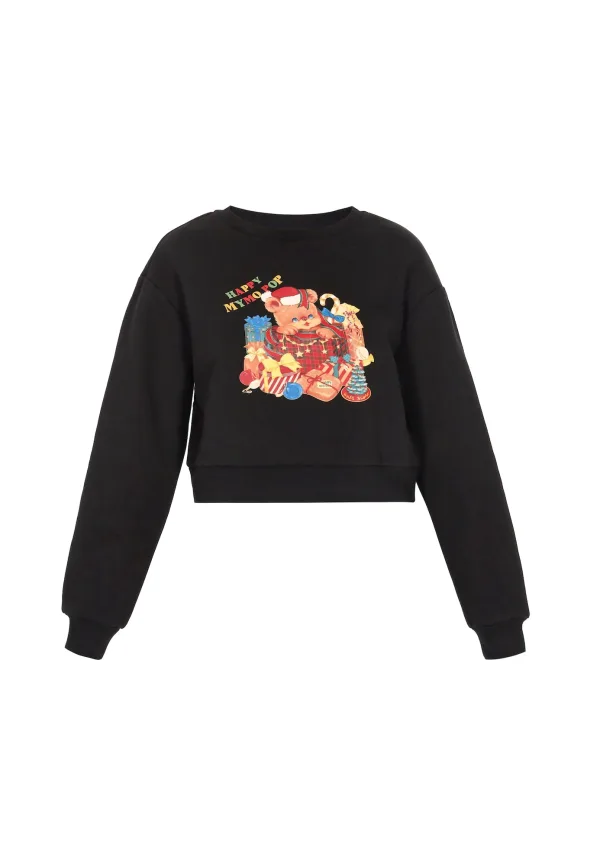 Design: Geribd ceintuurtje; Materiaal: Sweatstof; Halstype: Ronde hals; Motief: Motiefprint; Extra's: Kerstdesign; Pasvorm: Losse pasvorm; Armlengte: Lange mouw; Lengte: Korte pasvorm