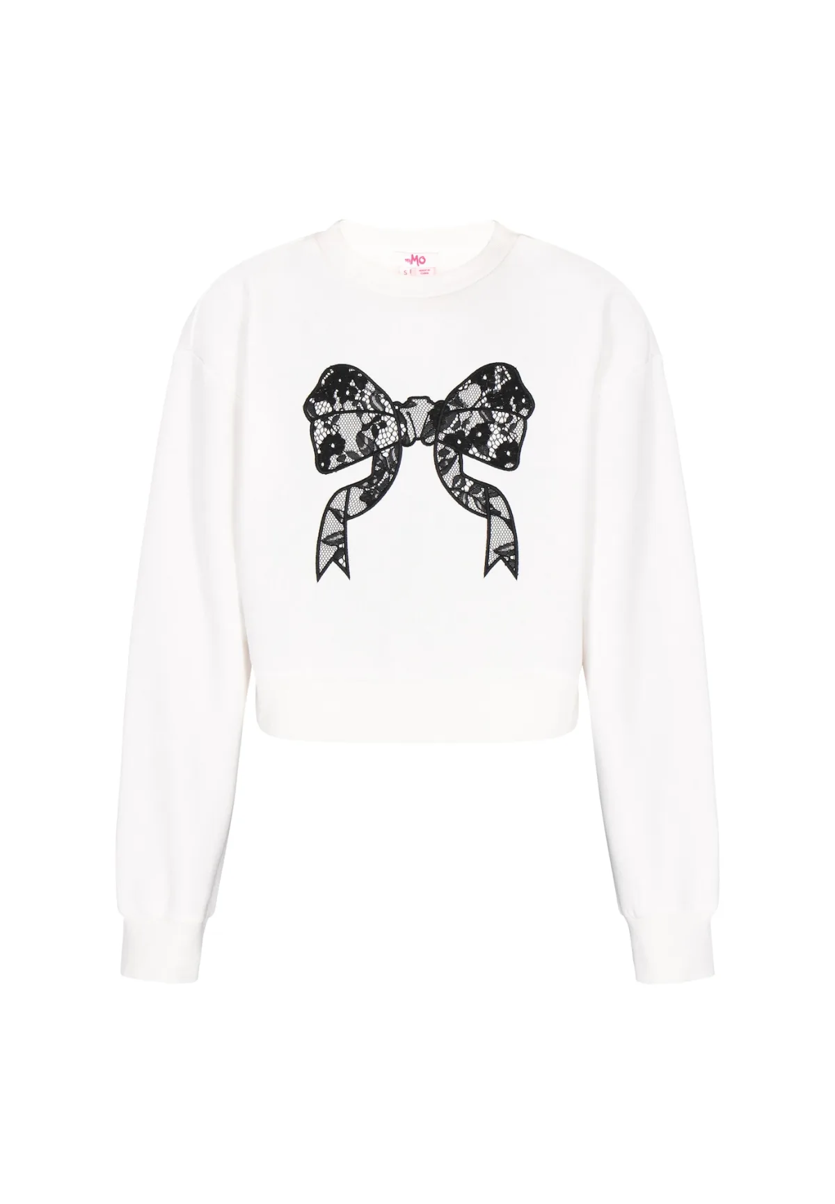Design: Geribd ceintuurtje; Type sluiting: Slip; Materiaal: Sweatstof; Halstype: Ronde hals; Motief: Motiefprint; Details: Kant, Borduursels; Extra's: Label patch/label flag, Op staal naden; Pasvorm: Losse pasvorm; Armlengte: Lange mouw; Lengte: Korte pasvorm