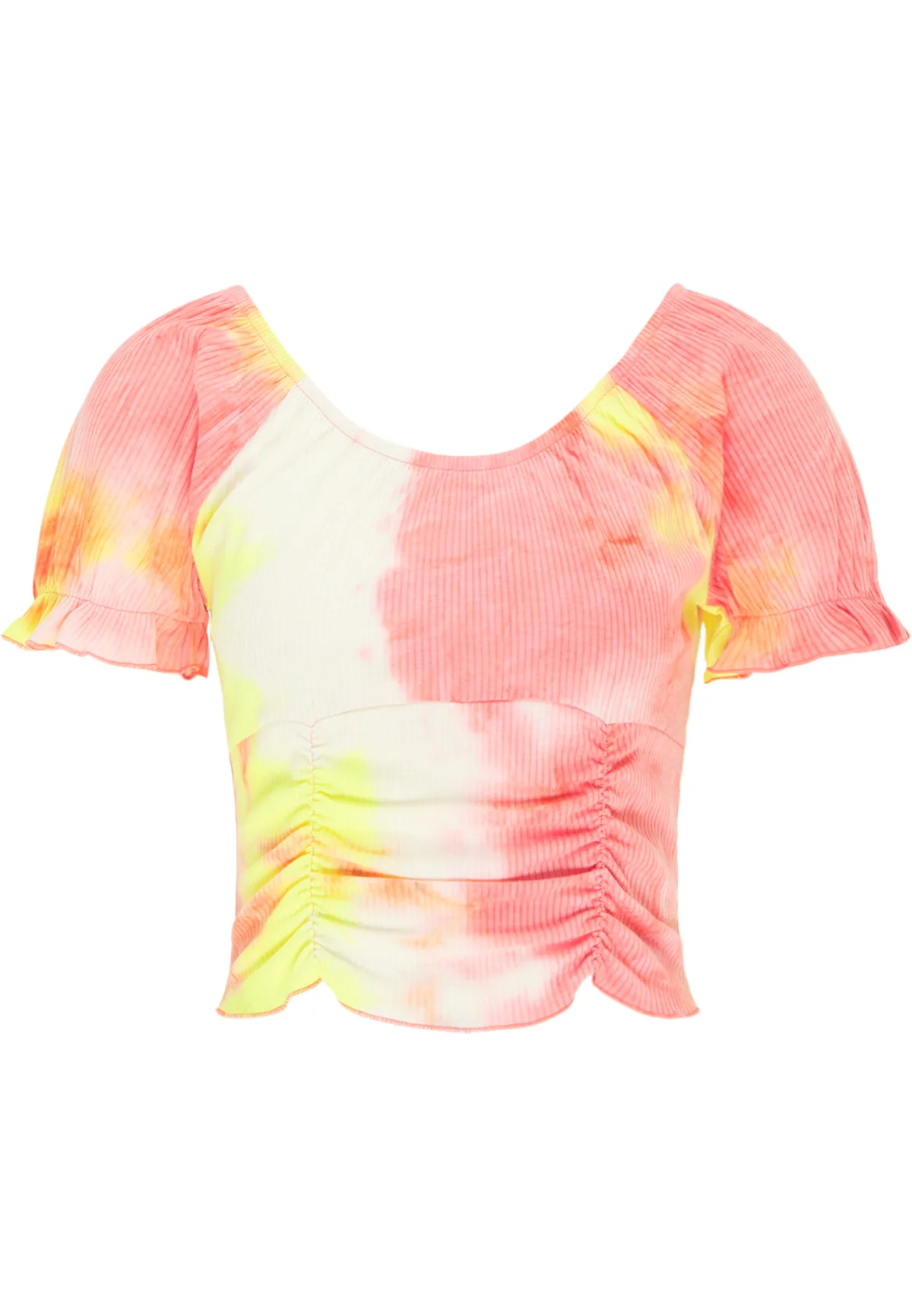 Geen voering/geen voering, geen vulling Creëer originele outfits in een handomdraai met dit geraffineerde shirt in batik-look. Gemaakt van een zachte rib, valt de stijl bijzonder goed op. De met elastiek verzamelde delen en de korte, elastische manchetten tonen veel creativiteit, die off-the-shoulder of bedekt gedragen kunnen worden. In combinatie met een jeans of korte broek creëer je in een handomdraai een stijlvolle en zomerse look. T-shirt