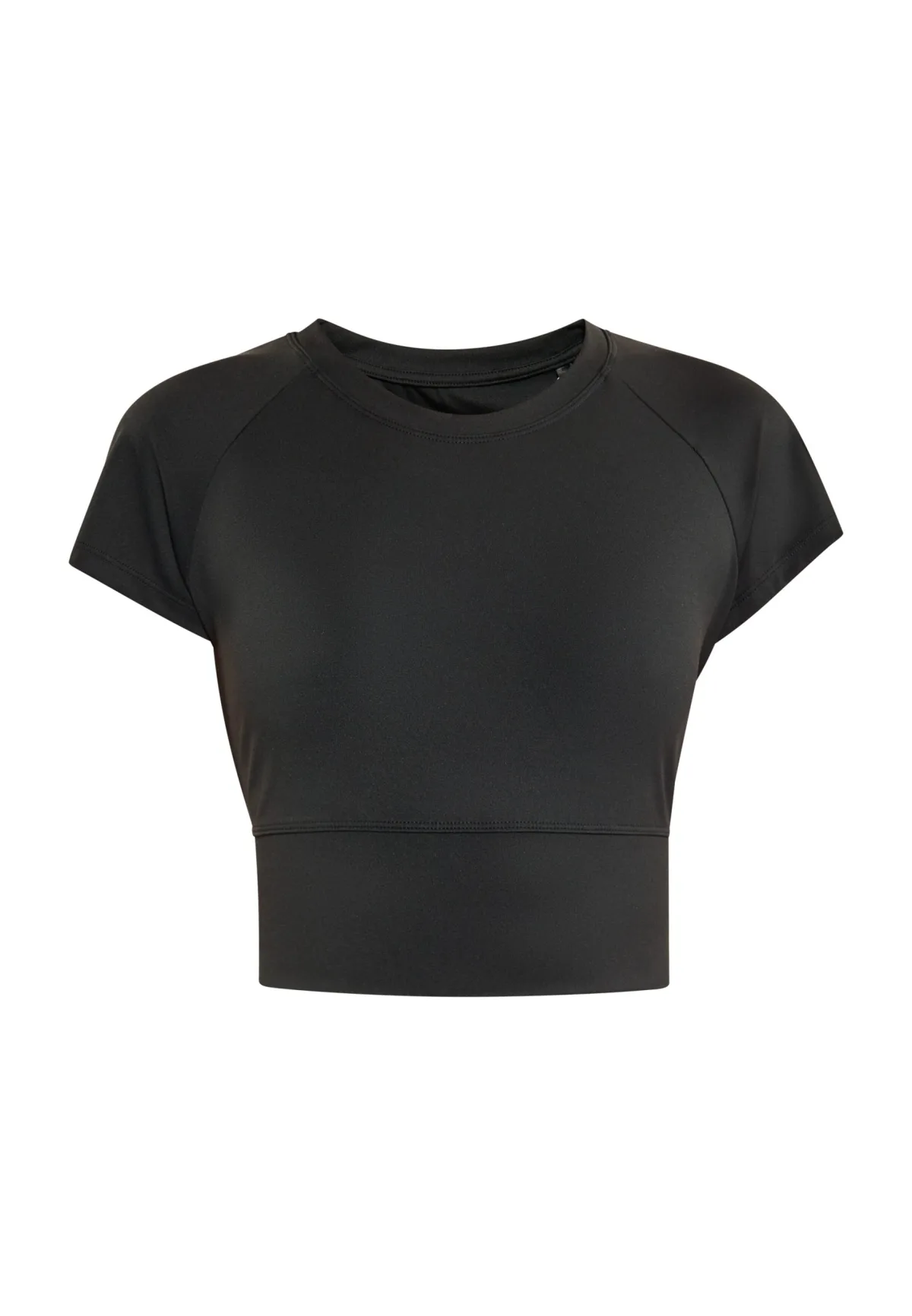 Geef je athleisure-garderobe een boost met dit sportieve crop-T-shirt. Het elastische crop-T-shirt heeft een getailleerd silhouet, ingezette korte mouwen en een ronde halslijn voor een goede pasvorm. Perfect voor yoga of vrijetijdskleding. Blijf comfortabel en stijlvol in deze athleisure-kleding. Top