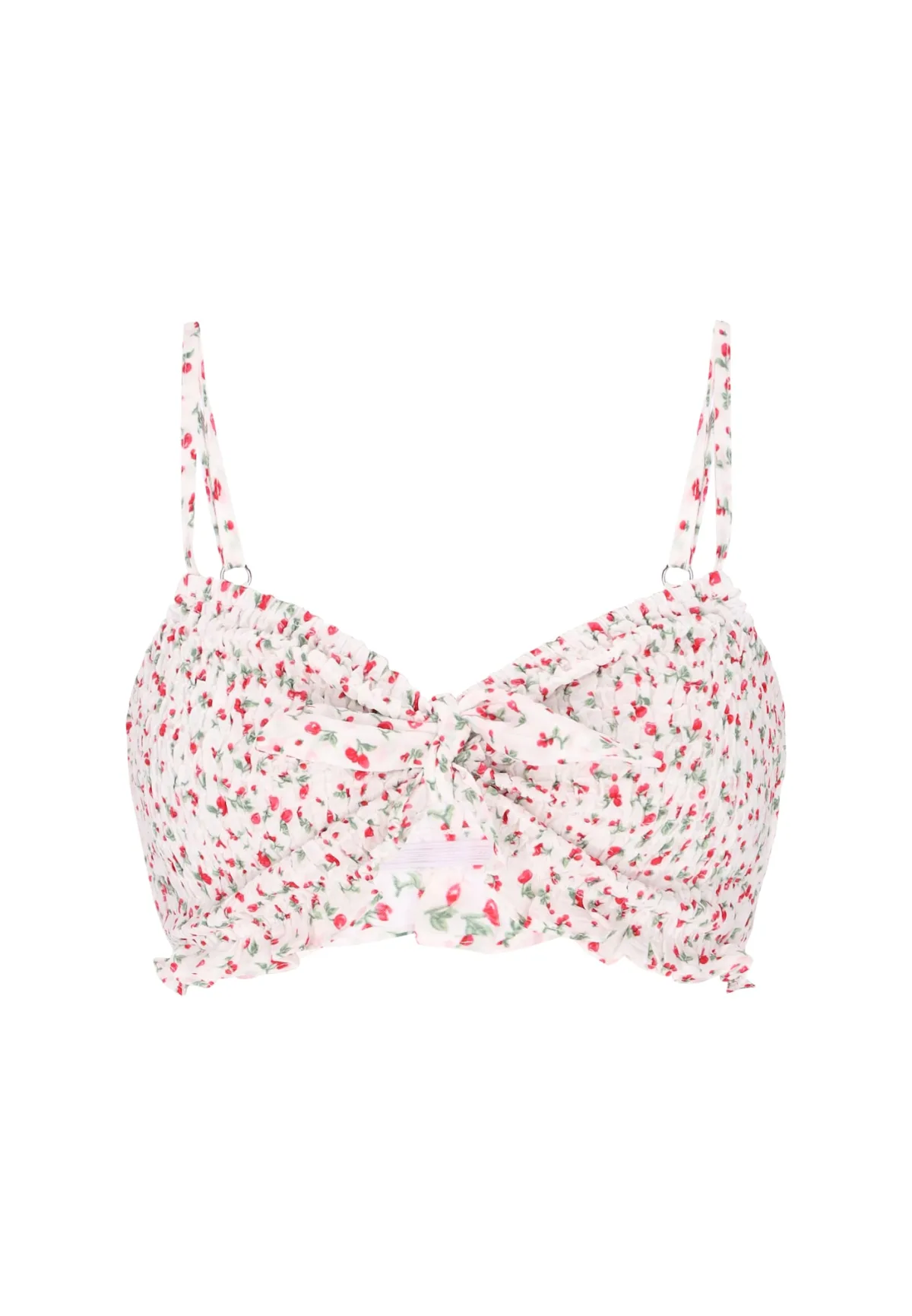 Design: Diepe snit/decolleté; Motief: Bloemenprint; Soort bandjes: Spaghettibandjes; Details: Ruches, Gedrapeerd; Extra's: All-over patroon; Pasvorm: Aansluitende pasvorm; Armlengte: Mouwloos; Lengte: Korte pasvorm