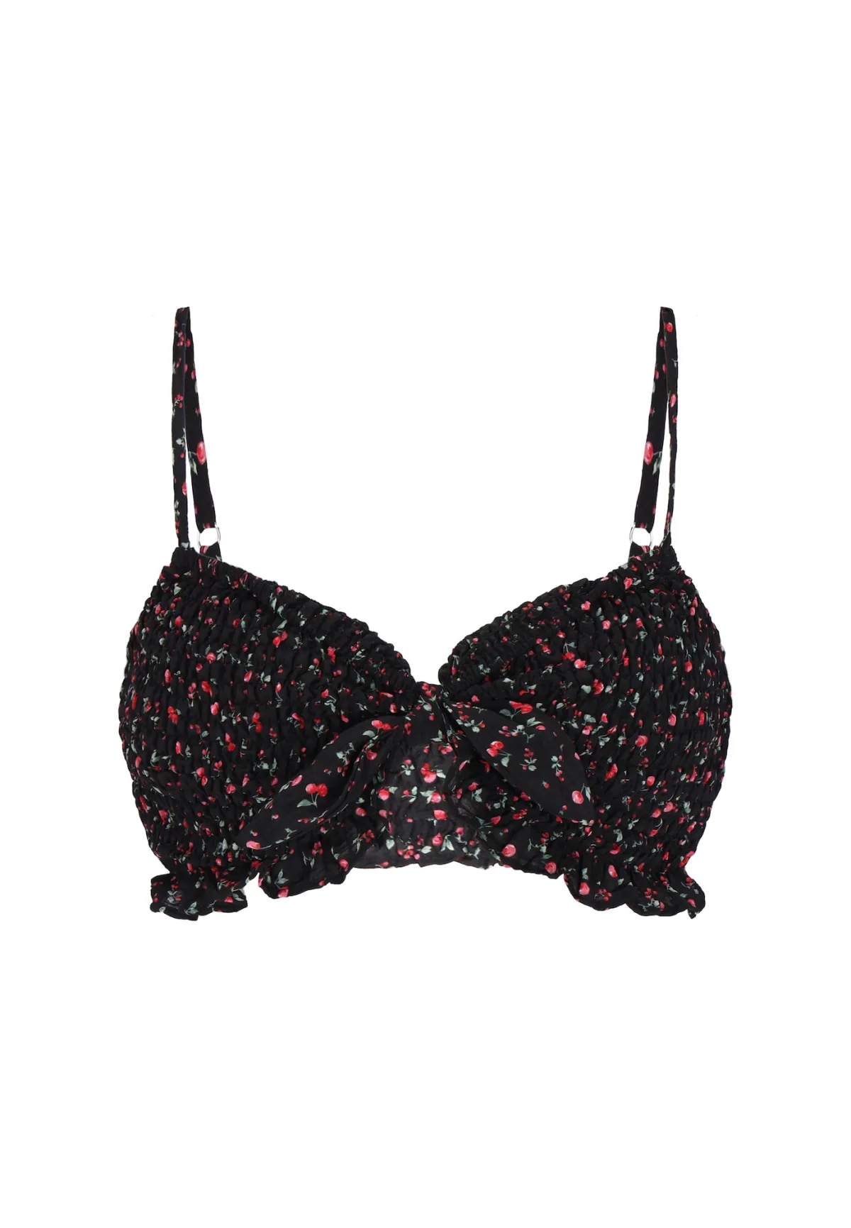 Design: Diepe snit/decolleté; Motief: Bloemenprint; Soort bandjes: Spaghettibandjes; Details: Ruches, Gedrapeerd; Extra's: All-over patroon; Pasvorm: Aansluitende pasvorm; Armlengte: Mouwloos; Lengte: Korte pasvorm