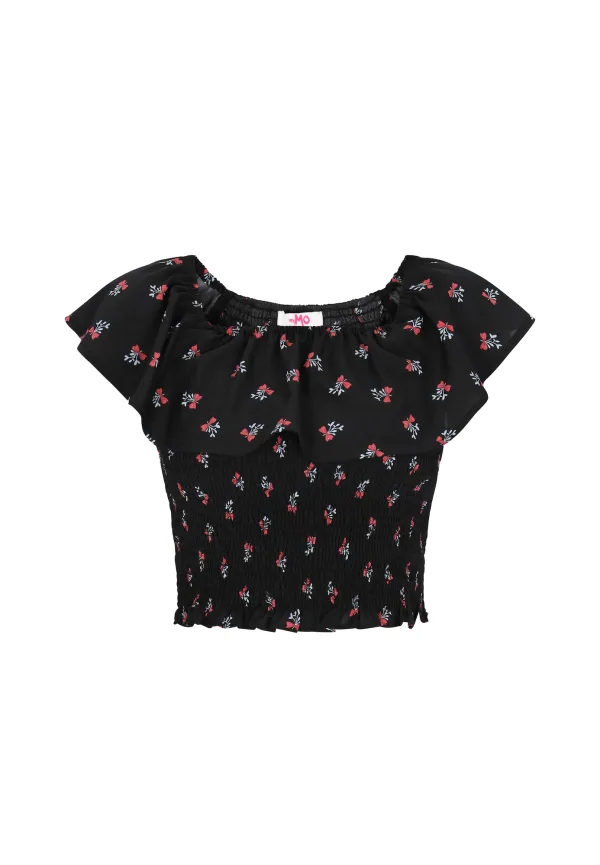 Blouse type: Blouseshirt; Design: Gevoerde zoom/rand; Materiaal: Jersey; Halstype: Carréhals; Kraag: Zonder kraag; Details: Ruches, Volant; Extra's: All-over patroon, Voelt zacht aan; Pasvorm: Slanke pasvorm; Armlengte: Kwartmouw; Lengte: Korte pasvorm