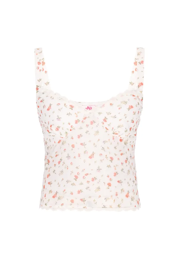 Design: Geschulpte zoom; Materiaal: Tule; Halstype: V-hals; Motief: Bloemenprint; Soort bandjes: Normale bandjes; Details: Kant; Extra's: Licht transparant, Verstelbare bandjes, Lichte stof; Pasvorm: Slanke pasvorm; Armlengte: Mouwloos; Lengte: Korte pasvorm