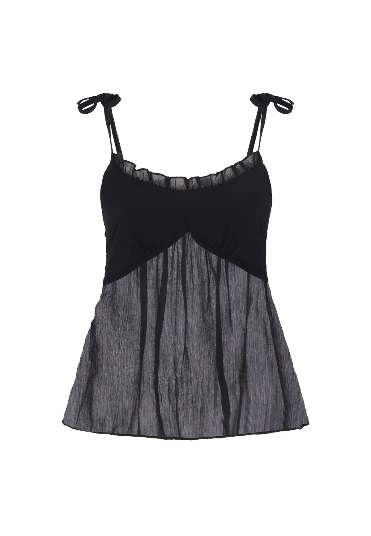Design: Gevoerde zoom/rand, Om te knopen/binden; Materiaal: Chiffon; Motief: Effen; Soort bandjes: Spaghettibandjes; Details: Ruches; Extra's: Licht transparant, Op staal naden; Pasvorm: Normale pasvorm; Armlengte: Mouwloos; Lengte: Normale lengte