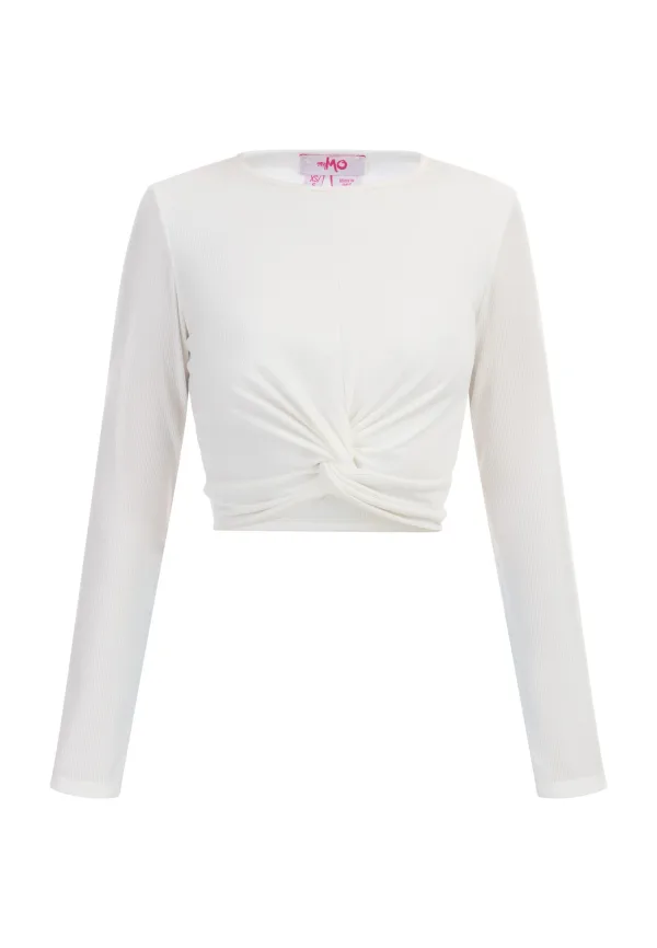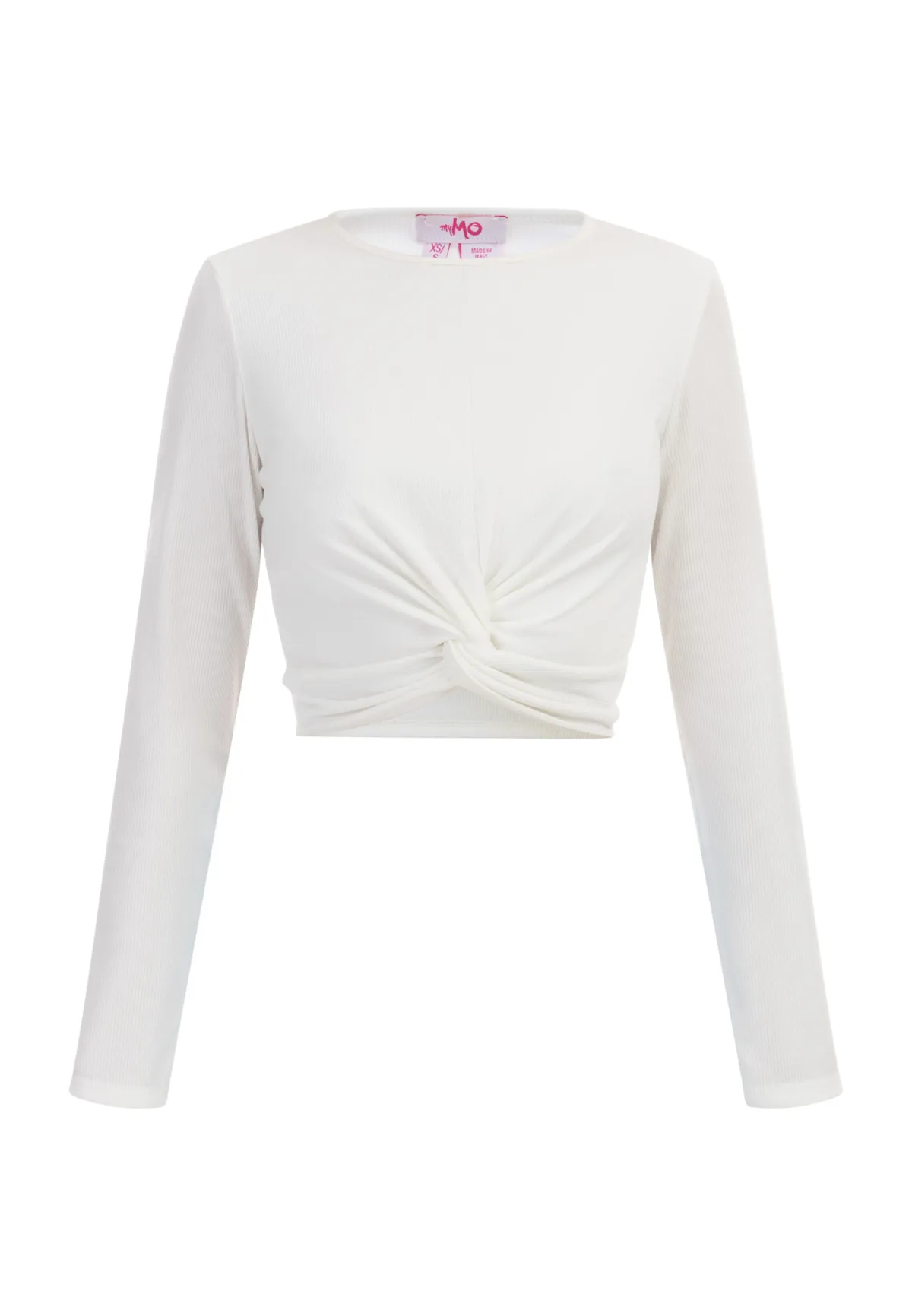 Het cropped shirt van myMo is in Italië gemaakt van een geribde jerseystof. Dankzij het knoopdetail heeft het een dynamische look met een ronde hals en lange mouwen. Gebreide top met lange mouwen
