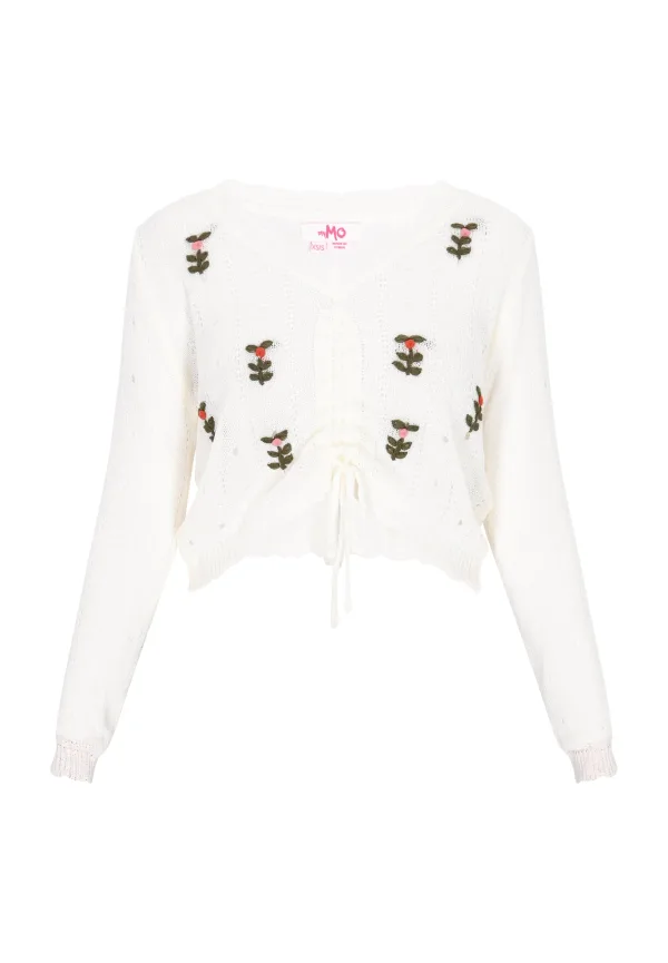 Design: Geribd ceintuurtje, Om te knopen/binden; Materiaal: Knitwear; Halstype: V-hals; Motief: Bloemenprint; Details: Borduursels, Gedrapeerd; Extra's: Fully fashioned, Met textuur; Pasvorm: Normale pasvorm; Armlengte: Lange mouw; Lengte: Korte pasvorm