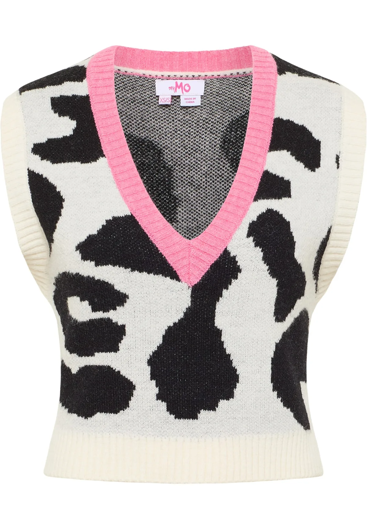 Geen voering/geen voering, geen vulling Het sweatervest viert een geweldige comeback! Daarom kiezen we voor het model van myMo, dat is gemaakt met een opvallend intarsia-patroon. De zachte garenmix schittert bovendien met de contrasterende diepe V-hals. De korte cropped snit rondt het sweatervest stijlvol af. Gecombineerd met een blouse eronder is het model perfect. Waistcoat