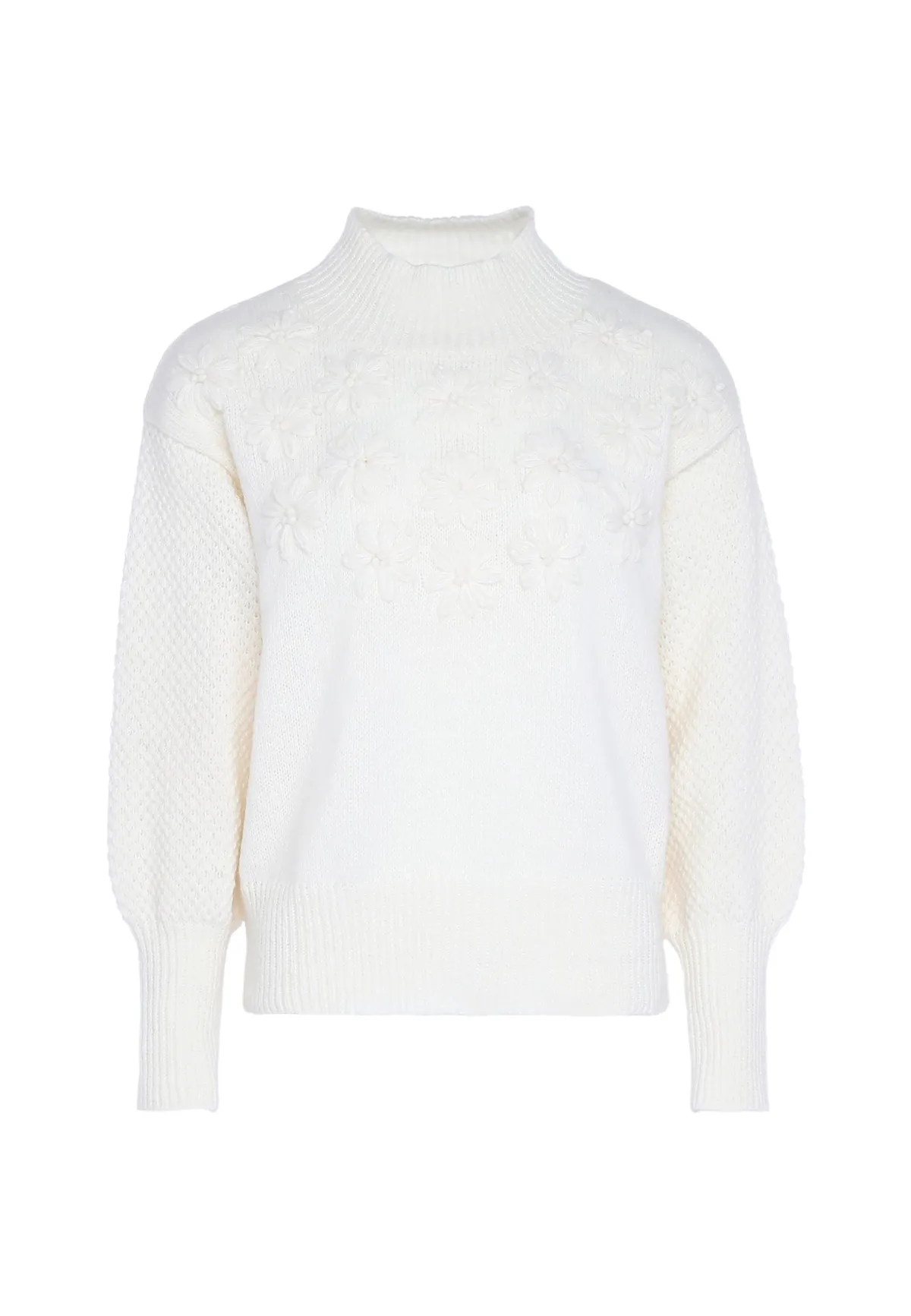 Deze myMo-trui maakt indruk met zijn charmante, speelse stijl en is voorzien van geborduurde bloemen aan de voorkant, terwijl de lantaarnmouwen een gestructureerd breisel hebben. Een geribde opstaande kraag en lange geribde manchetten ronden het ontwerp af. Pullover trui