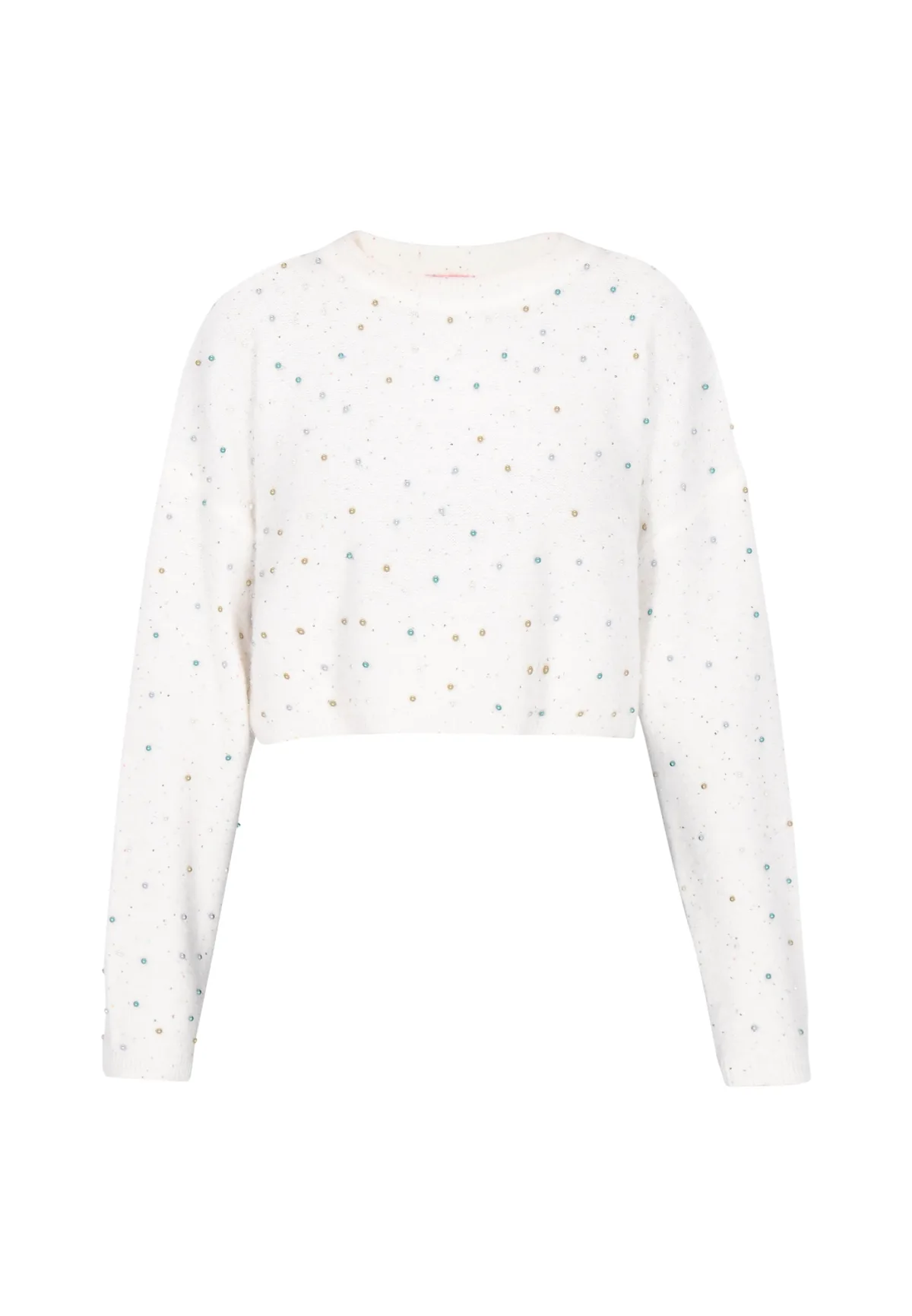 Design: Geribbelde kraag, Geribd ceintuurtje; Type sluiting: Slip; Materiaal: Knitwear; Halstype: Ronde hals; Details: Parels; Extra's: All-over patroon, Op staal naden; Pasvorm: Normale pasvorm; Armlengte: Lange mouw; Lengte: Korte pasvorm