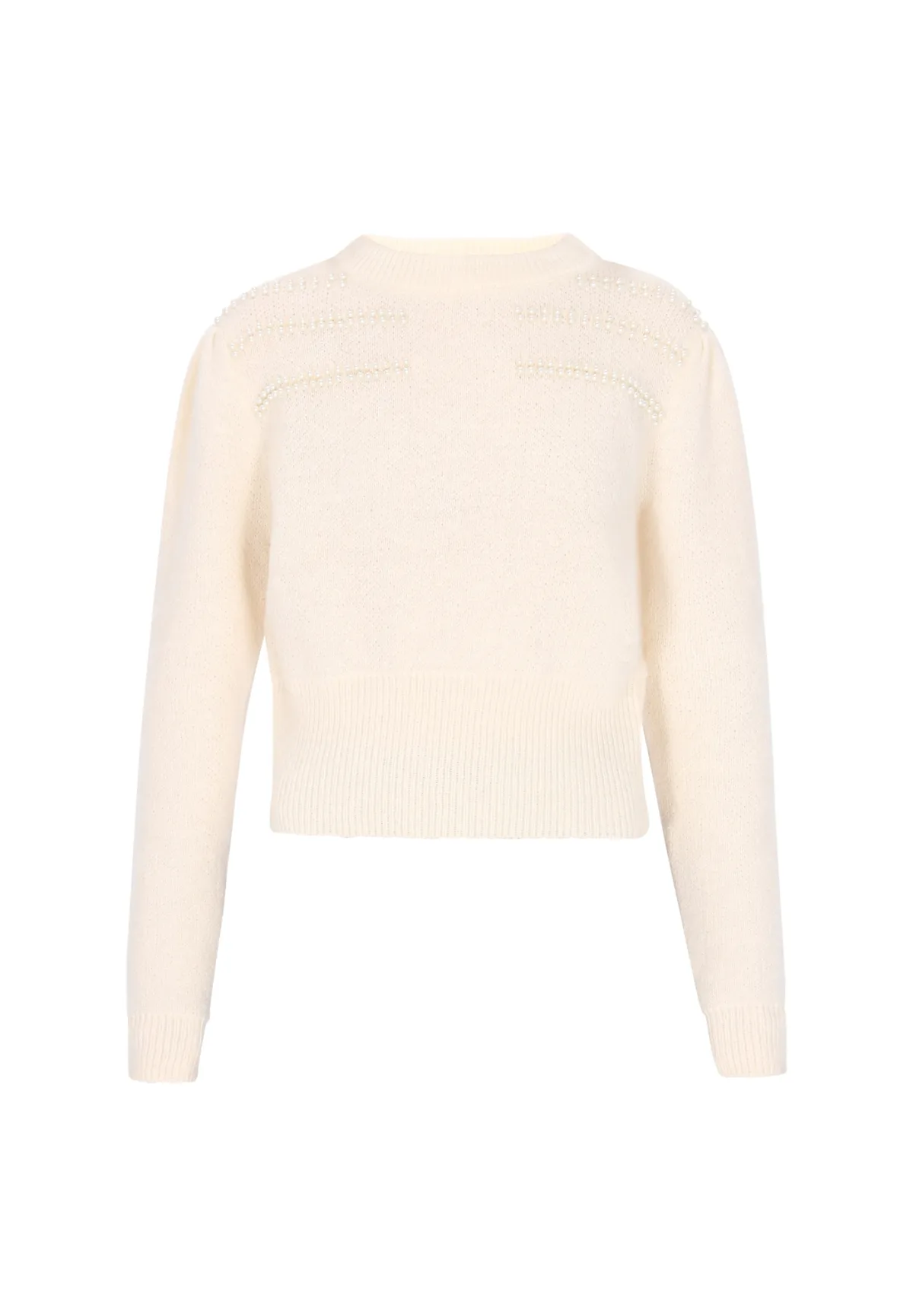 Design: Geribbelde kraag, Pofmouwen, Geribbeld gebreid; Type sluiting: Slip; Halstype: Ronde hals; Motief: Effen; Details: Parels; Extra's: Op staal naden; Pasvorm: Slanke pasvorm; Armlengte: Lange mouw; Lengte: Normale lengte