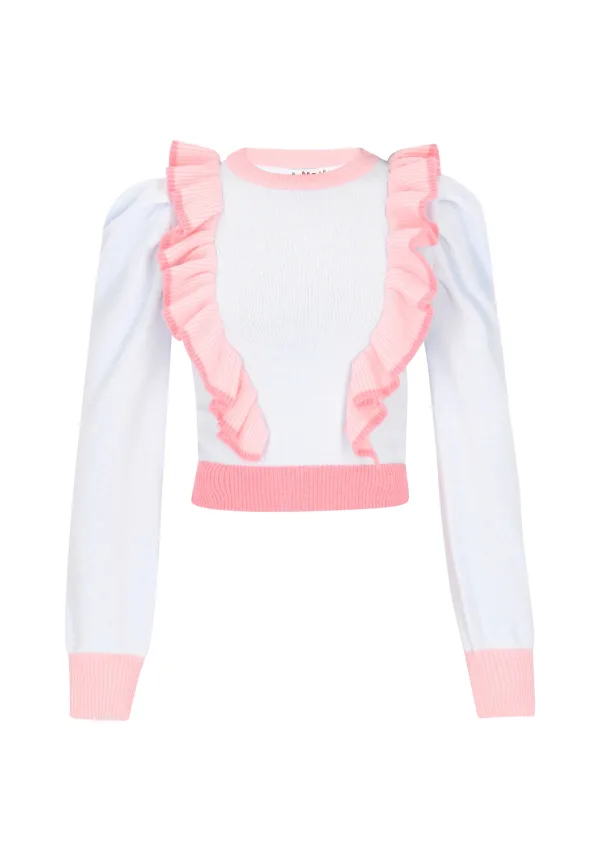 Design: Geribbelde kraag, Geribd ceintuurtje; Materiaal: Knitwear; Halstype: Ronde hals; Motief: Color-Blocking; Details: Volant, Plooien; Extra's: Fully fashioned, Voelt zacht aan; Pasvorm: Normale pasvorm; Armlengte: Lange mouw; Lengte: Korte pasvorm
