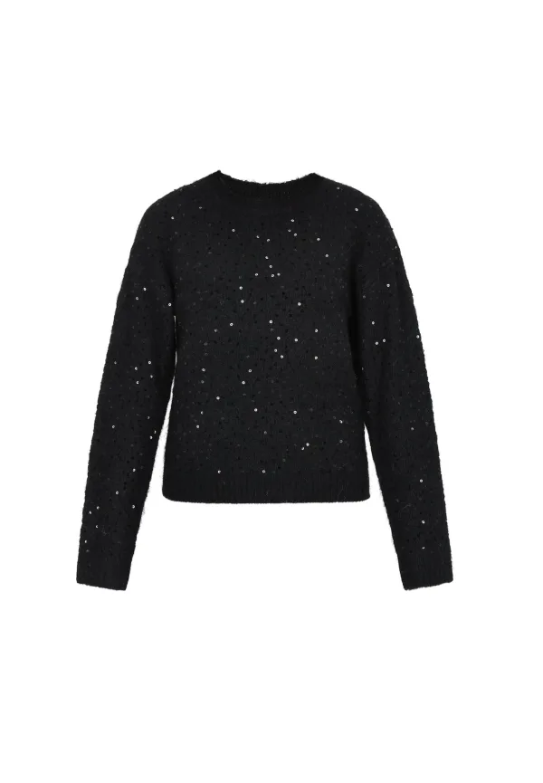 Design: Geribd ceintuurtje, Overcut schouder; Type sluiting: Slip; Materiaal: Knitwear; Halstype: Ronde hals; Details: Pailletten; Extra's: All-over patroon, Applicaties; Pasvorm: Losse pasvorm; Armlengte: Lange mouw; Lengte: Normale lengte