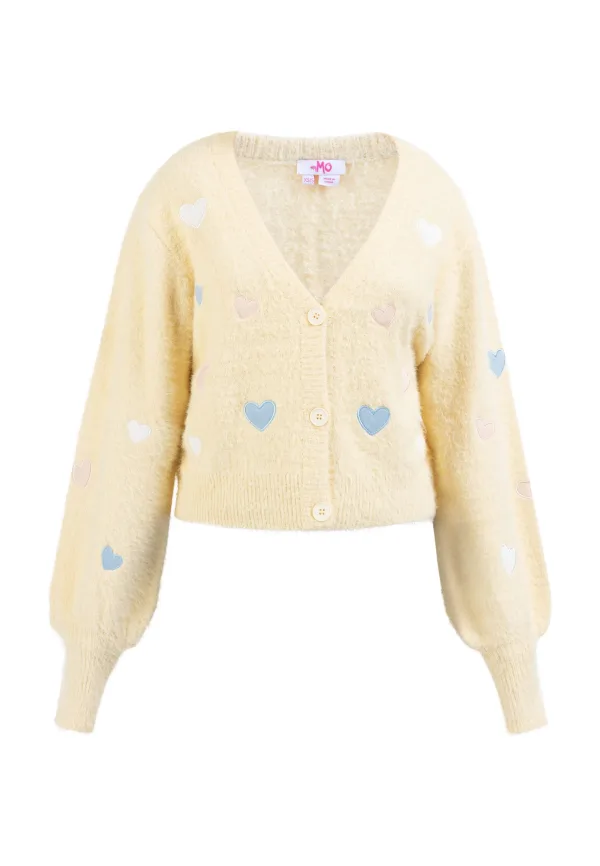 Liefde is: een zacht vest met hartjesmotief! Het ultrazachte garen met franjes heeft een hippe cropped stijl met een V-hals en drie knopen. Op de voorkant en op de wijde mouwen zijn kleurrijke hartjes geappliqueerd. Het zal zelfs in de koudste winter onze harten verwarmen.