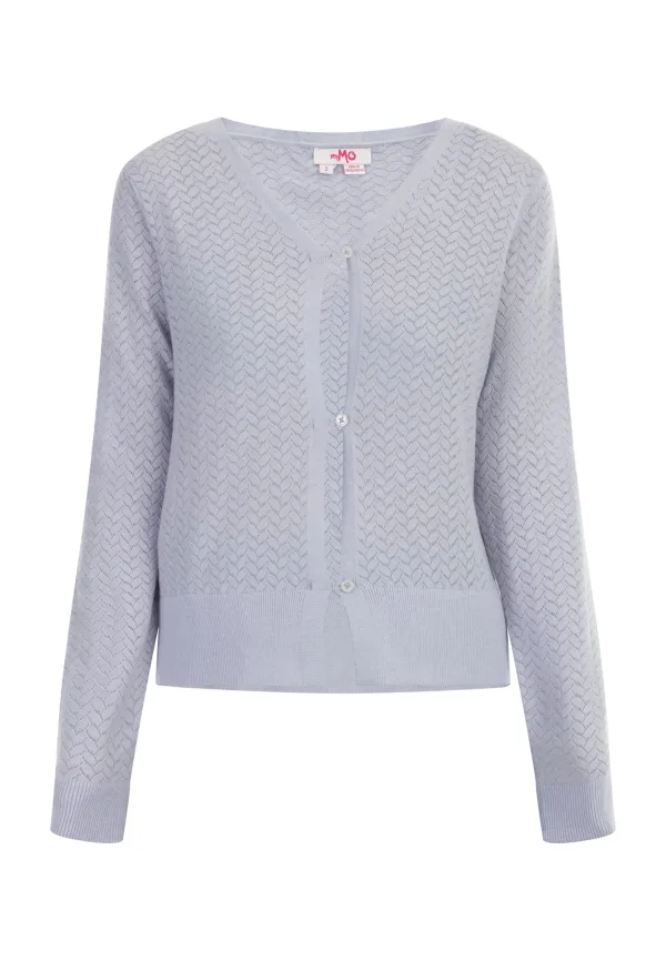 De delicate textuur en het delicate gatenpatroon geven dit vest van myMo zijn bijzondere uitstraling. Dankzij de zomerse pastelkleuren is het vest van een viscosemix een ideale metgezel op koele zomerdagen of -avonden. Drie kleine knoopjes en geribde manchetten maken het ontwerp compleet. Vest