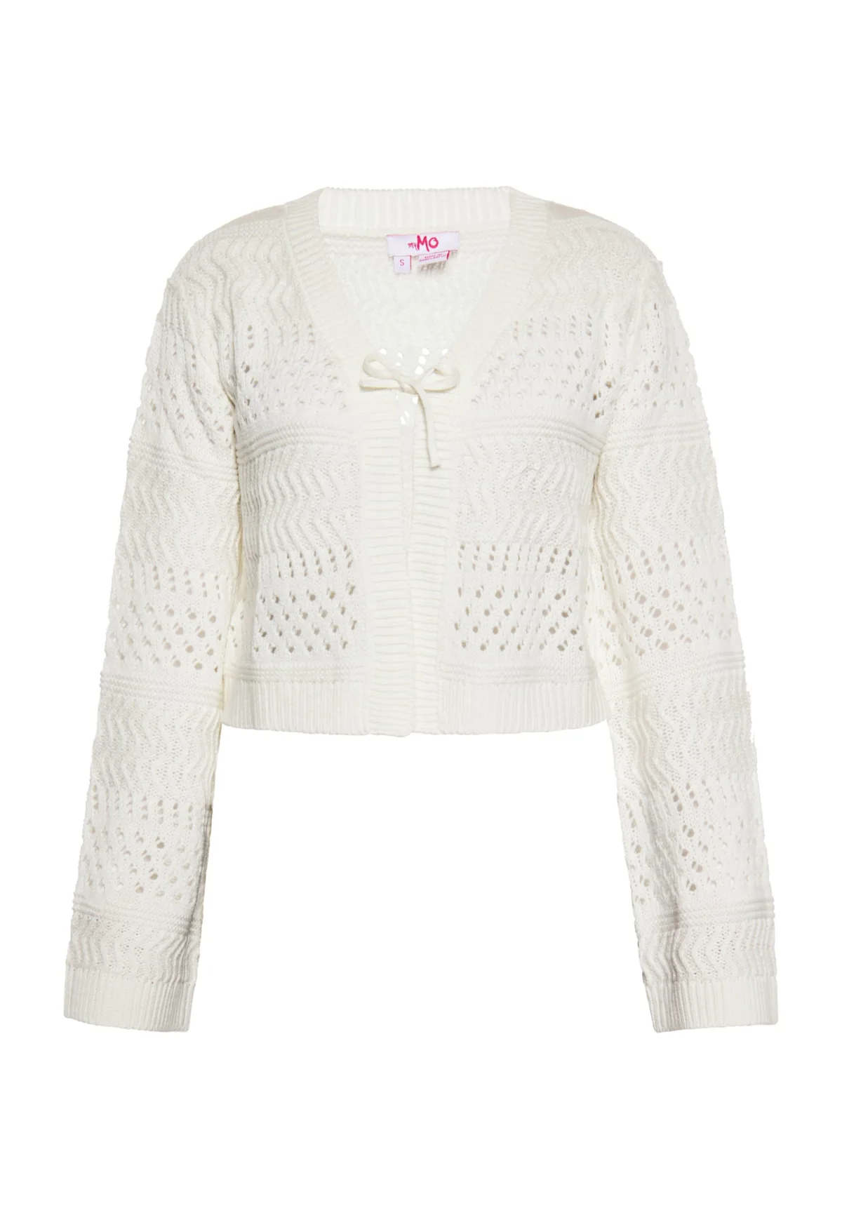 Ontdek een chique opengewerkt vest met een iets korter silhouet, een V-hals met biezen en een striksluiting aan de voorkant. Lange mouwen met gebreide boorden en rechte zoom maken de look compleet en stralen casual vrouwelijkheid uit, perfect om als laagje over elke outfit te dragen. Vest