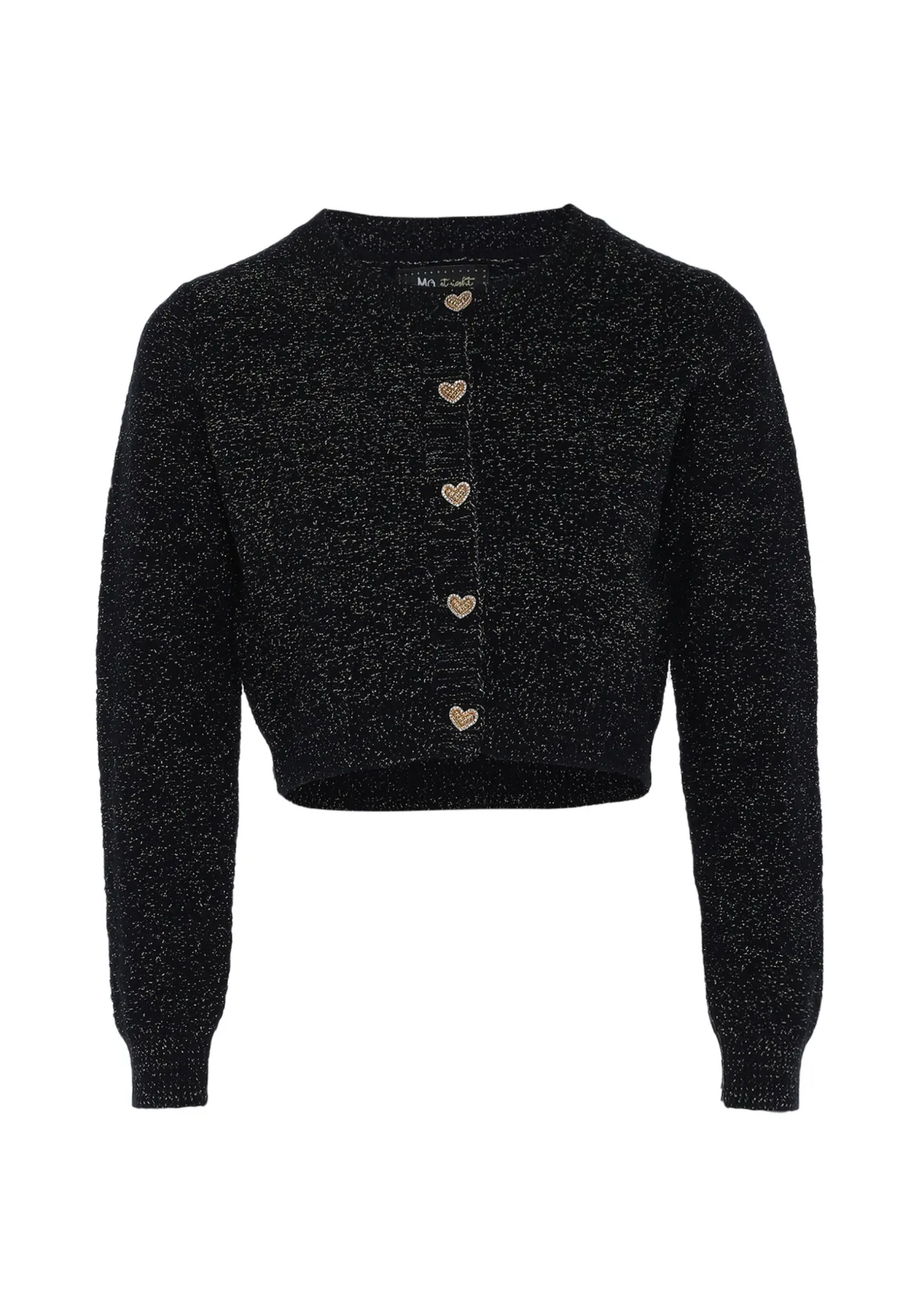 Dit glinsterende vestje van myMo at night is gebreid met een metallic garen en dankzij de hartjesknoopjes met strass bies ben jij er klaar voor het volgende feestje. Ribgebreide manchetten maken het ontwerp compleet. Vest trui