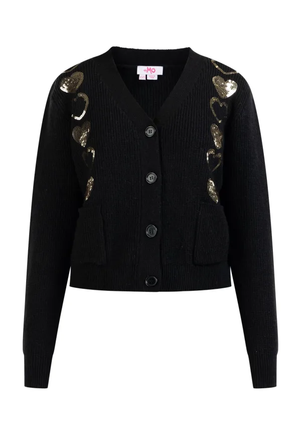 Hart van goud! Dit zachte vest van myMo maakt ons blij met zijn geborduurde paillettenapplicaties in de vorm van hartjes. Het is een vest dat zowel overdag als 's avonds kan worden gedragen. De zachte garenmix en de kleine opgestikte zakjes maken het mooie ontwerp af.