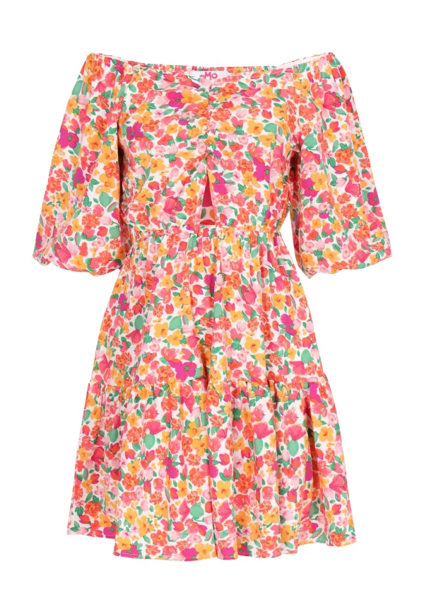 Design: Figuurnaden; Type sluiting: Slip; Halstype: Carmen hals; Motief: Bloemenprint; Details: Gedrapeerd; Lengte: Kort/mini; Pasvorm: Normale pasvorm; Armlengte: Halve mouw