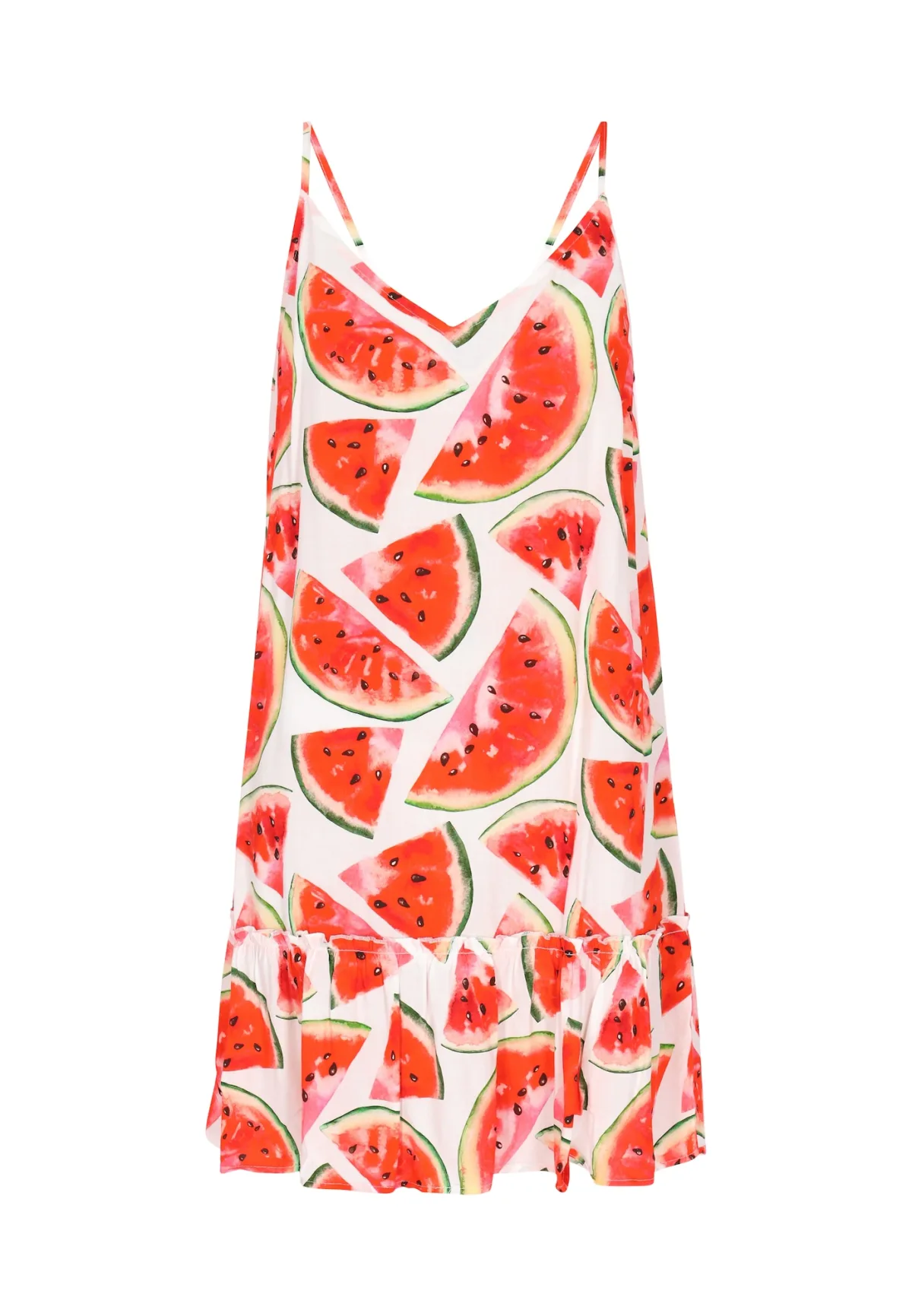 Design: Gevoerde zoom/rand; Materiaal: Viscose; Halstype: V-hals; Soort bandjes: Normale bandjes; Details: Volant; Extra's: Verstelbare bandjes, All-over patroon; Lengte: Kort/mini; Snit: Uitlopend; Pasvorm: Losse pasvorm; Armlengte: Mouwloos