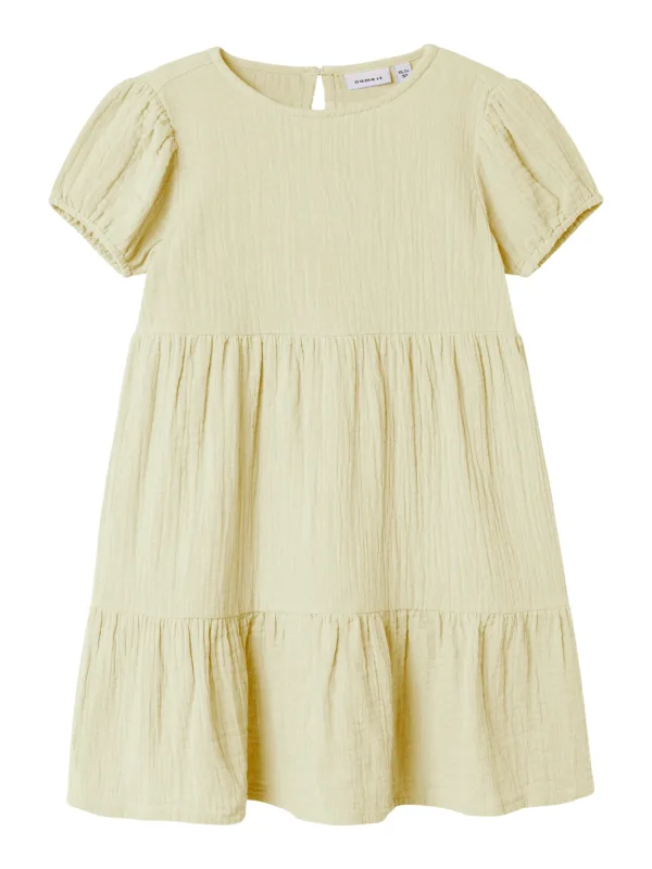 Deze jurk met ruches van zachte mousseline maakt elke dag een beetje luchtiger. De korte mouwen maken het comfortabel om te dragen, zelfs op warme dagen. Een contrasterende rok geeft het ontwerp een swingende en speelse elegantie. De fijne bies aan de hals- en armopeningen geeft het een geraffineerd accent. De omgeslagen zoom op de rok benadrukt de mooie afwerking. Het luchtige materiaal drapeert zacht en begeleidt elk avontuur. Het geweven label aan de binnenkant geeft de jurk een hoogwaardige touch. Perfect voor speciale momenten en dagelijks gebruik. Of je hem nu draagt voor feestelijke of casual gelegenheden - hij zal altijd een blikvanger zijn. Een jurk die elk meisje zal laten stralen.